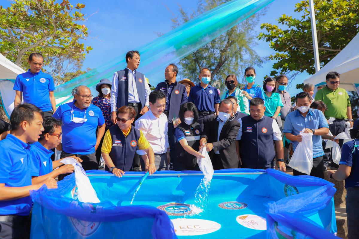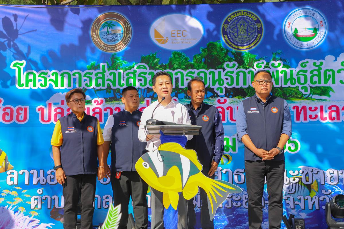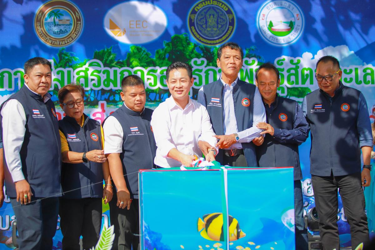 และชายฝั่งให้แก่ประชาชนและส่วนราชการในพื้นที่ และเป็นการเพิ่มจำนวนสัตว์ทะเล รักษาสมดุลระบบนิเวศ โดยการปล่อยพันธุ์สัตว์ทะเลให้กลับคืนสู่ธรรมชาติ สำหรับพันธุ์สัตว์ทะเลที่ได้จัดเตรียมไว้เพื่อปล่อยในวันนี้ ประกอบด้วย กุ้งทะเล, ปลากะพงขาว, หอยหวาน, ปลาการ์ตูนอินเดียแดง และปลาการ์ตูนอานม้า เพื่อให้เป็นมรดกทางธรรมชาติอยู่คู่กับทะเลระยองต่อไป