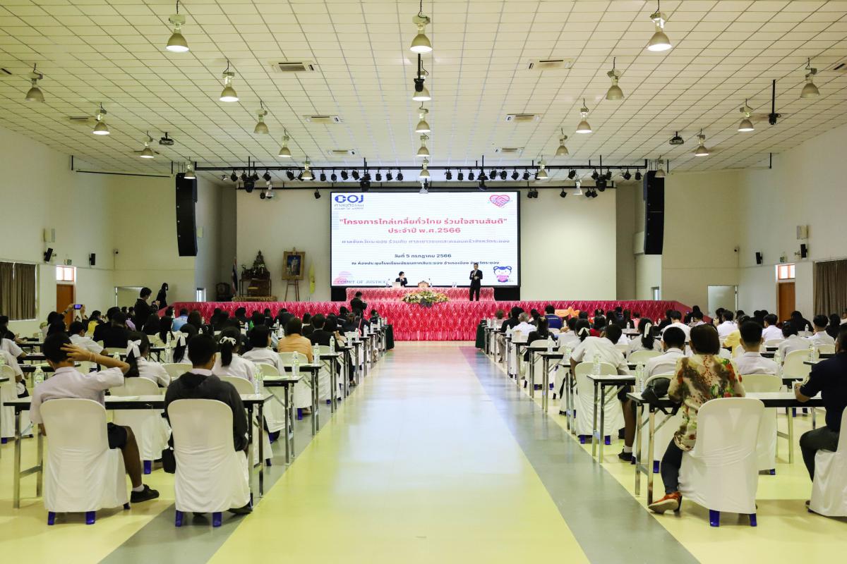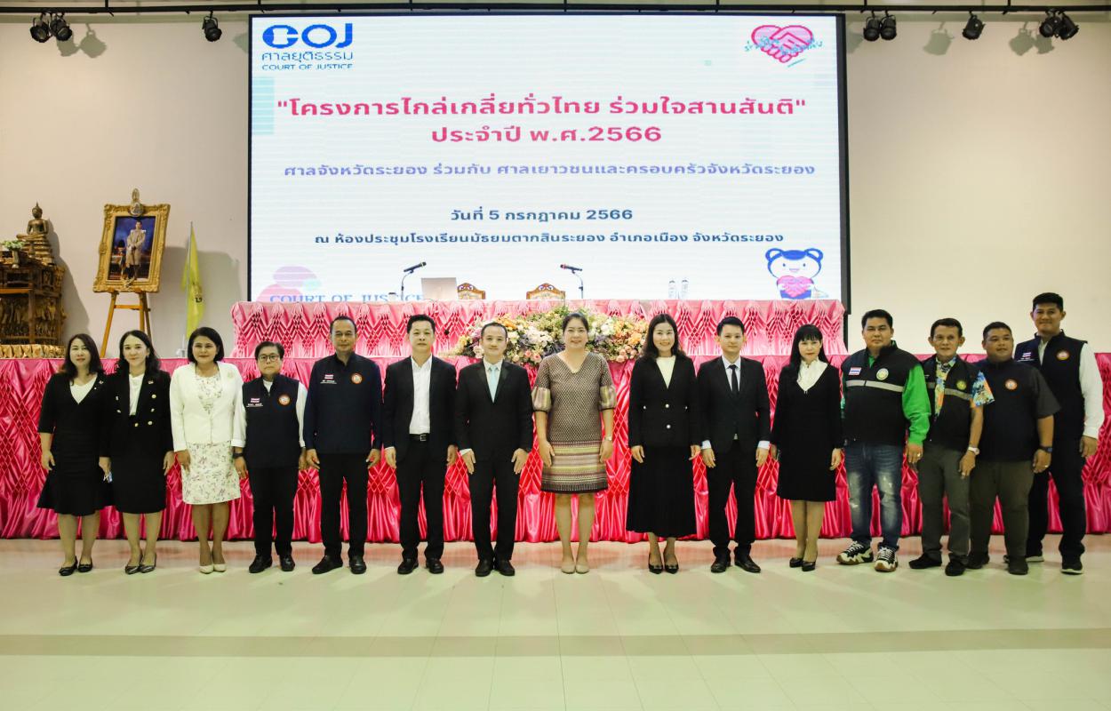วันที่ 5 กรกฎาคม 2566 เวลา 09.00 น. นายกิตติ เกียรติ์มนตรี รองนายกองค์การบริหารส่วนจังหวัดระยอง (1) พร้อมด้วย นางสาวตุลยา พันธุ์ขะวงศ์ด่านพัฒนามงคล ผู้พิพากษาหัวหน้าศาลจังหวัดระยอง, นางสาวพิชชาภา สาครมณีรัตน์ ผู้พิพากษาหัวหน้าศาลเยาวชนและครอบครัว, นายสันติ ผิวทองคำ ผู้พิพากษาศาลเยาวชนและครอบครัว, นายธนวัตน์ สินเกษม ผู้พิพากษาศาลจังหวัดระยอง สมาชิกสภาองค์การบริหารส่วนจังหวัดระยอง ผู้นำชุมชน และเจ้าหน้าที่ที่เกี่ยวข้องเข้าร่วมโครงการ "ไกล่เกลี่ยทั่วไทย ร่วมใจสานสันติ" โดยพร้อมเพรียงกัน