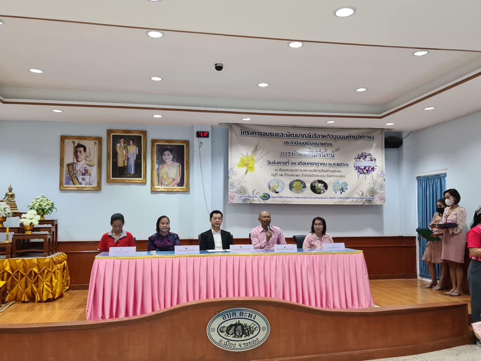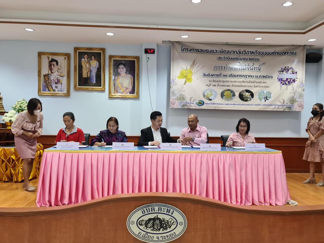 วันที่ 11 กรกฎาคม 2566 เวลา 09.00 น. นายกิตติ เกียรติ์มนตรี รองนายกองค์การบริหารส่วนจังหวัดระยอง (1) พร้อมด้วย สมาชิกสภาองค์การบริหารส่วนจังหวัดระยอง และเจ้าหน้าที่ที่เกี่ยวข้องเข้าร่วมพิธีเปิดโครงการอบรมและพัฒนากลุ่มวิสาหกิจชุมชนตำบลตะพง ประจำปี 2566 และร่วมลงนามบันทึกข้อตกลง (MOU) ระหว่าง องค์การบริหารส่วนตำบลตะพง, องค์การบริหารส่วนจังหวัดระยอง, กศน. อำเภอเมืองระยอง, พัฒนาการอำเภอเมืองระยอง และเกษตรอำเภอเมืองระยอง เพื่อสนับสนุนส่งเสริมการเรียนรู้ กระตุ้นให้เกิดการส่งเสริมพัฒนาวิสาหกิจชุมชนในพื้นที่ตำบลตะพง ให้มีอาชีพเพื่อเพิ่มรายได้ให้กับชุนชนและครอบครัว และพัฒนาพื้นที่ให้เป็นแหล่งเรียนรู้ในอนาคต ณ ห้องประชุมสภาองค์การบริหารส่วนตำบลตะพง อำเภอเมืองระยอง จังหวัดระยอง