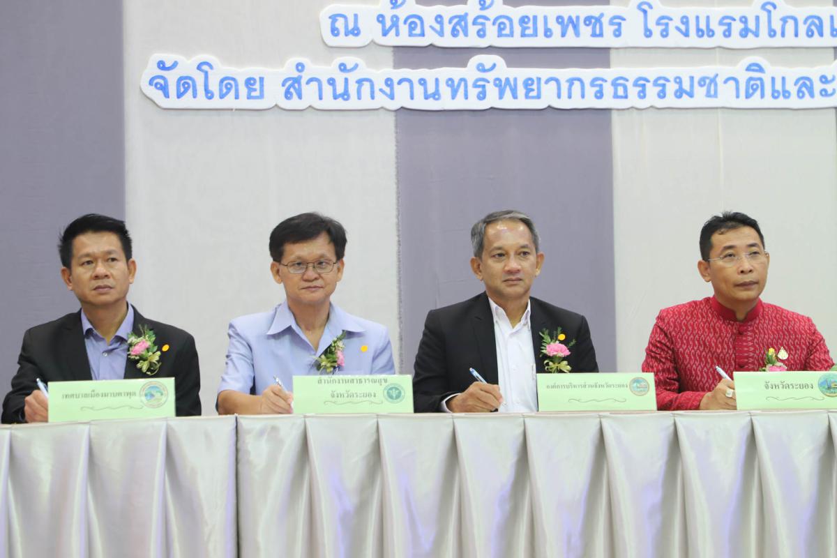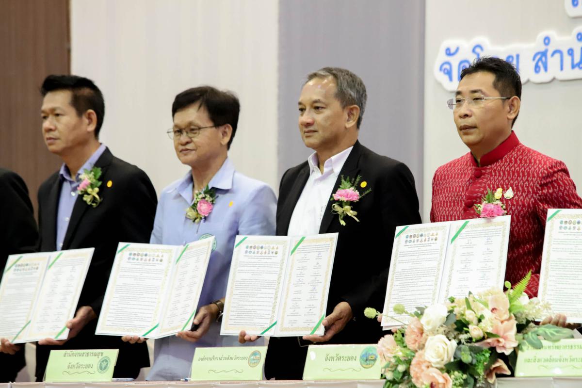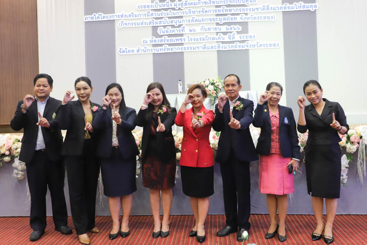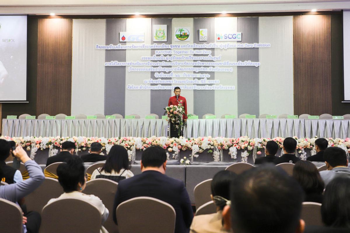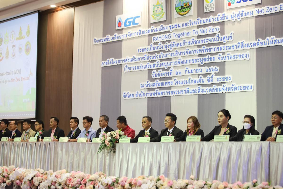 วันที่ 26 กันยายน 2566 เวลา 09.30 น. นายประสานต์ พฤกษาชาติ รองนายกองค์การบริหารส่วนจังหวัดระยอง (2) พร้อมด้วย นางณิชาพร คุ้มท้วม ผู้อำนวยการกองทรัพยากรธรรมชาติและสิ่งแวดล้อม และเจ้าหน้าที่ที่เกี่ยวข้อง เข้าร่วมพิธีเปิดกิจกรรมขับเคลื่อนการจัดการสิ่งแวดล้อมเมือง ชุมชน และโรงเรียนอย่างยั่งยืน มุ่งสู่สังคม Net Zero Emission โดยมี นายไตรภพ วงศ์ไตรรัตน์ ผู้ว่าราชการจังหวัดระยอง เป็นประธานในพิธีเปิด พร้อมด้วย นายเฉลิม พุ่มไม้ ผู้อำนวยการสำนักงานทรัพยากรธรรมชาติและสิ่งแวดล้อมจังหวัดระยอง เป็นผู้กล่าวรายงานวัตถุประสงค์ของการจัดกิจกรรมฯ โดยสำนักงานทรัพยากรธรรมชาติและสิ่งแวดล้อมจังหวัดระยอง ได้จัดกิจกรรมขับเคลื่อนการจัดการสิ่งแวดล้อมเมือง ชุมชน และโรงเรียนอย่างยั่งยืน มุ่งสู่สังคม Net Zero Emission ภายใต้โครงการส่งเสริมการมีส่วนร่วมในการบริหารจัดการทรัพยากรธรรมชาติสิ่งแวดล้อมให้สมดุล กิจกรรมส่งเสริมสนับสนุนการคัดแยกขยะมูลฝอย จังหวัดระยอง โดยมีวัตถุประสงค์เพื่อขับเคลื่อนการบริหารจัดการสิ่งแวดล้อม ชุมชน และโรงเรียนอย่างยั่งยืน และการเฝ้าระวังคุณภาพสิ่งแวดล้อม พร้อมเรียนรู้ผลกระทบด้านการเปลี่ยนแปลงสภาพภูมิอากาศ มุ่งเน้นการเพิ่มประสิทธิภาพการลดก๊าซเรือนกระจก เพิ่มขีดความสามารถในการปรับตัวต่อการเปลี่ยนแปลงสภาพภูมิอาศกาศ และมุ่งสู่สังคม Carbon Neutrality และ Net Zero Emission ภายในงานได้มีพิธีลงนามบันทึกข้อตกลง (MOU) ว่าด้วยความร่วมมือดำเนินงานโครงการส่งเสริมการมีส่วนร่วมในการบริหารจัดการทรัพยากรธรรมชาติสิ่งแวดล้อมให้สมดุล การบรรยายในหัวข้อเรื่อง "จังหวัดระยอง กับการเข้าสู่ Carbon Neutrality ในปี ค.ศ. 2050" และเวทีเสวนาในหัวข้อ "Ready to Change ยกระดับเมือง มุ่งสู่สังคม Net Zero Emission" และการจัดบูธนิทรรศการ "Rayong Green Goal to Net Zero" โดยหน่วยงานรัฐ ภาคเอกชน และชุมชน ณ ห้องสร้อยเพชร โรงแรมโกลเด้น ซิตี้ ระยอง อำเภอเมืองระยอง จังหวัดระยอง