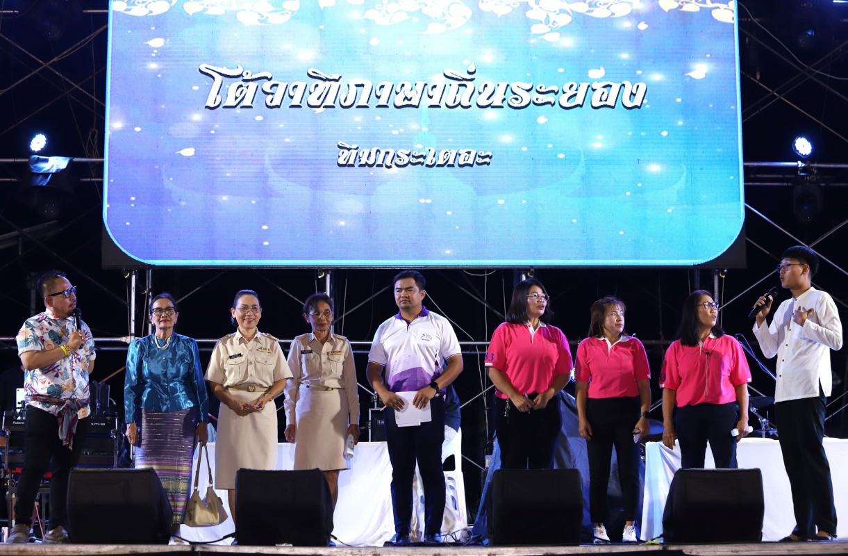 “รายการโต้วาทีภาษาถิ่น, ท่านได้ยินก็รู้, จุดมุ่งหมายเพื่อเชิดชู, ภาษาถิ่นของระยอง, ระยองของเรานี่สำเนียงกล่าวเป็นเอกลักษณ์, อยากให้รู้จักเนี่ยสำเนียงถิ่นระยอง, เราคนระยองต้องช่ำชองภาษาถิ่น, คนต่างบ้านได้ยืนรู่ว่านี่แหละถิ่นระยอง, ขอฝากลูกหลานจงช่วยกันสืบทอด, สำเนียงถิ่นจะอยู่รอดคู่ระยองเอย - ขอขอบคุณบทกลอนจากชมรมภาษาถิ่น ตำบลกระเฉด