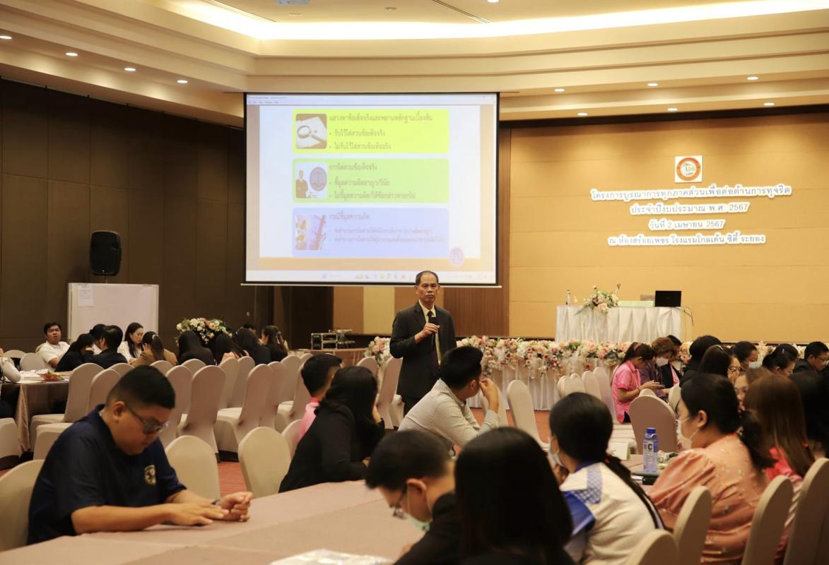 โครงการดังกล่าวมีวัตถุประสงค์เพื่อให้องค์กรปกครองส่วนท้องถิ่นในจังหวัดระยอง ร่วมขับเคลื่อนและเสริมสร้างศักยภาพการทำงานร่วมกันในการป้องกันและปราบปรามการทุจริต สร้างกลไกในการบูรณาการให้ทุกภาคส่วนได้ร่วมกันส่งเสริม สนับสนุนและสร้างค่านิยมในการต่อต้านการทุจริต เพื่อเป็นการเพิ่มประสิทธิภาพประสิทธิผลการดำเนินงานขององค์กรปกครองส่วนท้องถิ่นในจังหวัดระยอง ซึ่งการอบรมในครั้งนี้ได้รับเกียรติจาก นางสาวพรพิมล ชัยเจริญไมตรี นักวิชาการยุติธรรมชำนาญการพิเศษ สำนักงานป้องกันและปราบปรามการทุจริตในภาครัฐ เขต 2, พันตำรวจโท วิโรจน์ มีดา นักสืบสวนสอบสวนชำนาญการพิเศษ สำนักงานป้องกันและปราบปรามการทุจริตในภาครัฐ เขต 2, นายประกิจ อุทัยศรี นักวิชาการยุติธรรมชำนาญการ สำนักงานป้องกันและปราบปรามการทุจริตในภาครัฐ เขต 2 มาเป็นวิทยากรในการบรรยายความรู้แลกเปลี่ยนความคิดเห็น และแสดงเจตนารมณ์ในการดำเนินงานด้านป้องกันการทุจริตร่วมกันต่อไป