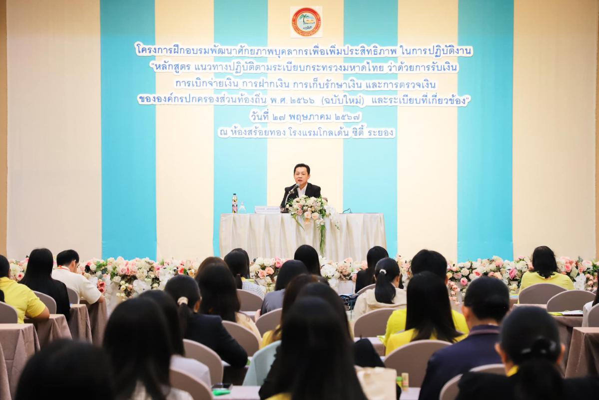 วันที่ 27 พฤษภาคม 2567 เวลา 09.00 น. นายกิตติ เกียรติ์มนตรี รองนายกองค์การบริหารส่วนจังหวัดระยอง (1) ให้เกียรติเป็นประธานเปิดโครงการฝึกอบรมพัฒนาศักยภาพบุคลากรเพื่อเพิ่มประสิทธิภาพในการปฏิบัติงาน "หลักสูตร แนวทางปฏิบัติตามระเบียบกระทรวงมหาดไทย ว่าด้วยการรับเงินการเบิกจ่ายเงิน การฝากเงิน การเก็บรักษาเงินและการตรวจเงินขององค์กรปกครองส่วนท้องถิ่น พ.ศ. ๒๕๖๖ (ฉบับใหม่) และระเบียบที่เกี่ยวข้อง" พร้อมด้วย คณะผู้บริหาร หัวหน้าส่วนราชการ ข้าราชการ ข้าราชการครูองค์การบริหารส่วนจังหวัด พนักงานจ้างและเจ้าหน้าที่ที่เกี่ยวข้องเข้าร่วมเปิดโครงการฯ โดยมี นายสุรินทร์ แสงทอง ปลัดองค์การบริหารส่วนจังหวัดระยอง เป็นผู้กล่าวรายงาน ซึ่งได้รับเกียรติจาก อาจารย์ ดร.อุษณีย์ ทอย ผู้เชี่ยวชาญด้านการเงินการคลังท้องถิ่น ข้าราชการบำนาญ สังกัดสำนักบริหารการคลังท้องถิ่นกรมส่งเสริมการปกครองท้องถิ่น มาเป็นผู้บรรยายให้ความรู้แก่ผู้เข้าร่วมโครงการฯ ณ ห้องสร้อยทอง โรงแรมโกลเด้น ซิตี้ ระยอง อำเภอเมืองระยอง จังหวัดระยอง