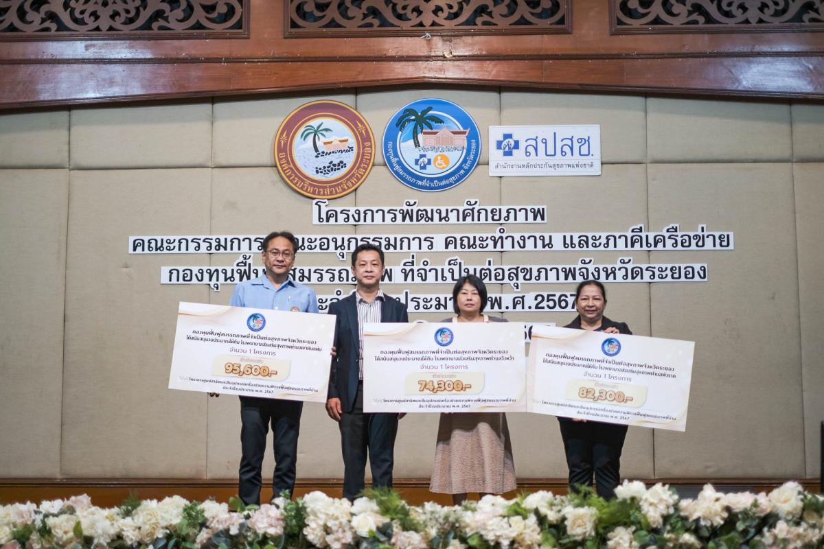 โครงการพัฒนาศักยภาพคณะกรรมการ คณะอนุกรรมการ คณะทำงาน และภาคีเครือข่าย กองทุนฟื้นฟูสมรรถภาพที่จำเป็นต่อสุขภาพจังหวัดระยอง ประจำปีงบประมาณ พ.ศ. 2567 จัดขึ้นเพื่อเสริมสร้างทักษะการบริหารจัดการกองทุนฟื้นฟูสมรรถภาพที่จำเป็นต่อสุขภาพจังหวัดระยอง และเพื่อเป็นการบูรราการด้านการฟื้นฟูสุขภาพกับหน่วยบริการ และหน่วยงานที่เกี่ยวข้อง รวมไปถึงยังเป็นการให้ผู้ปฏิบัติงานได้มีความรู้ ความเข้าใจในกฎหมาย และข้อระเบียบที่เกี่ยวข้อง โดยได้รับเกียรติจาก นางสาวจุฑามาศ ชาติเกษม นักพัฒนาสังคมชำนายการพิเศษ หัวหน้ากลุ่มการพัฒนาสังคมและสวัสดิการ, นายสุริยัน สกุลศิริไพบูลย์ ผู้จัดการกลุ่มภารกิจ สปสช. เขต 6 ระยอง, นางสาวฟ้านาวิน รอดเที่ยง นักบริหารงานหลักประกันสุขภาพ สปสช. เขต 6 ระยอง และนายอธิราช อิงประสาร รองประธานศูนย์ปันน้ำใจสาธุ มูลนิธิโรงพยาบาลสมเด็จพระนางเจ้าสิริกิติ์ ร่วมเป็นวิทยากรให้ความรู้แก่ผู้เข้าร่วมโครงการ ณ ห้องประชุมสุนทรภู่ โรงแรมสตาร์ คอนเวนชั่น อำเภอเมืองระยอง จังหวัดระยอง
