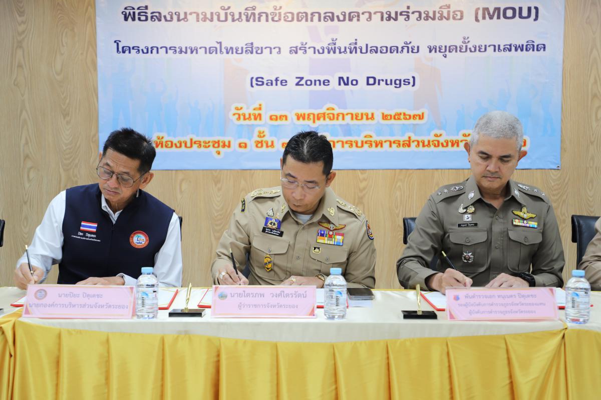 วันที่ 13 พฤศจิกายน 2567 เวลา 10.30 น. นายปิยะ ปิตุเตชะ นายกองค์การบริหารส่วนจังหวัดระยอง ร่วมลงนามบันทึกข้อตกลง (MOU) โครงการมหาดไทยสีขาว สร้างพื้นที่ปลอดภัย หยุดยั้งยาเสพติด (Safe Zone No Drugs) พร้อมด้วย นายไตรภพ วงศไตรรัตน์ ผู้ว่าราชการจังหวัดระยอง, พันตำรวจเอกทนุเนตร ปิตุเตชะ รองผู้บังคับการตำรวจภูธรจังหวัดระยองแทนผู้บังคับการตำรวจภูธรจังหวัดระยอง, นาวาเอกวีระชัย บุญมาก รองผู้อำนวยการกองอำนวยการรักษาความมั่นคงภายในจังหวัดระยอง, นายแพทย์สุรวิทย์ ศักดานุภาพ นายแพทย์สาธารณสุขจังหวัดระยอง, นายเรืองฤทธิ์ ประกอบธรรม ปลัดจังหวัดระยอง, นายพิทยุตม์ กงกุล รองศึกษาธิการจังหวัดระยองแทนศึกษาธิการจังหวัดระยอง, หัวหน้าส่วนราชการระดับจังหวัด นายอำเภอ และผู้บริหารหน่วยงานภาคการศึกษา ร่วมลงนามบันทึกข้อตกลง (MOU) อย่างพร้อมเพรียงกัน เพื่อเป็นการขับเคลื่อนการแก้ไขปัญหายาเสพติดในพื้นที่ โดยมีเจตจำนงร่วมมือกันดำเนินการตามอำนาจหน้าที่และความรับผิดชอบของหน่วยงานในการแก้ไขปัญหายาเสพติด ณ ห้องประชุม 1 ชั้น 3 อบจ.ระยอง