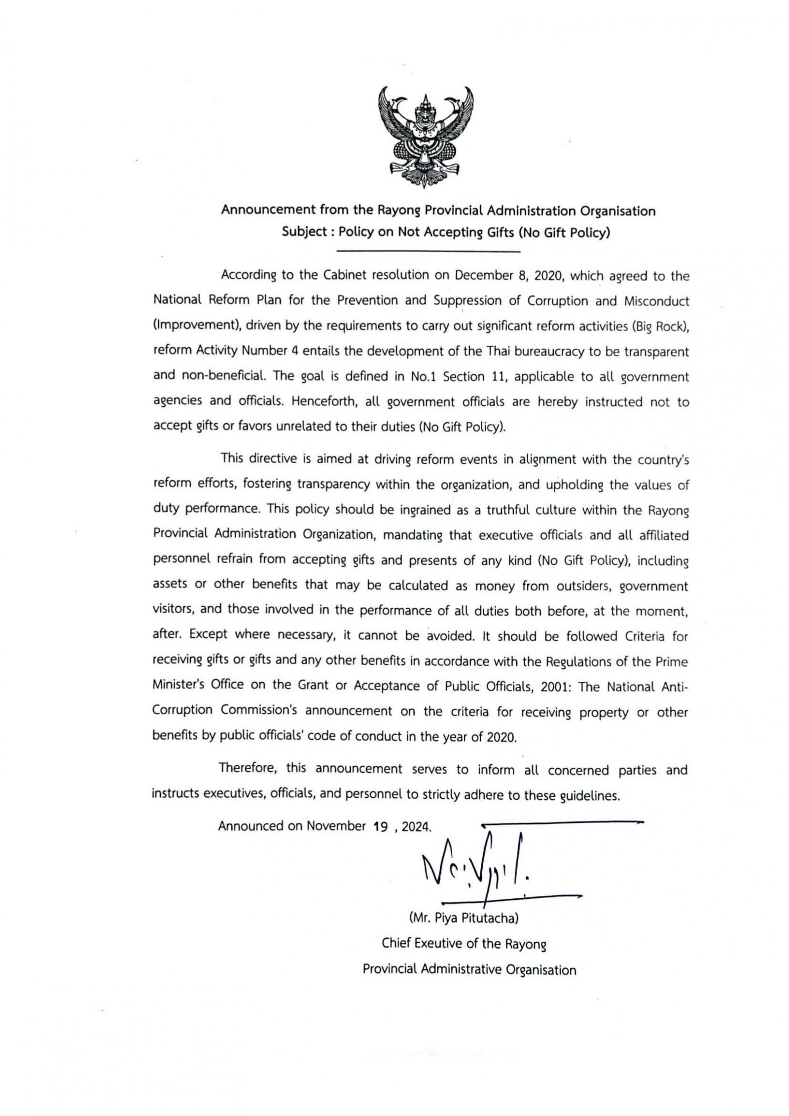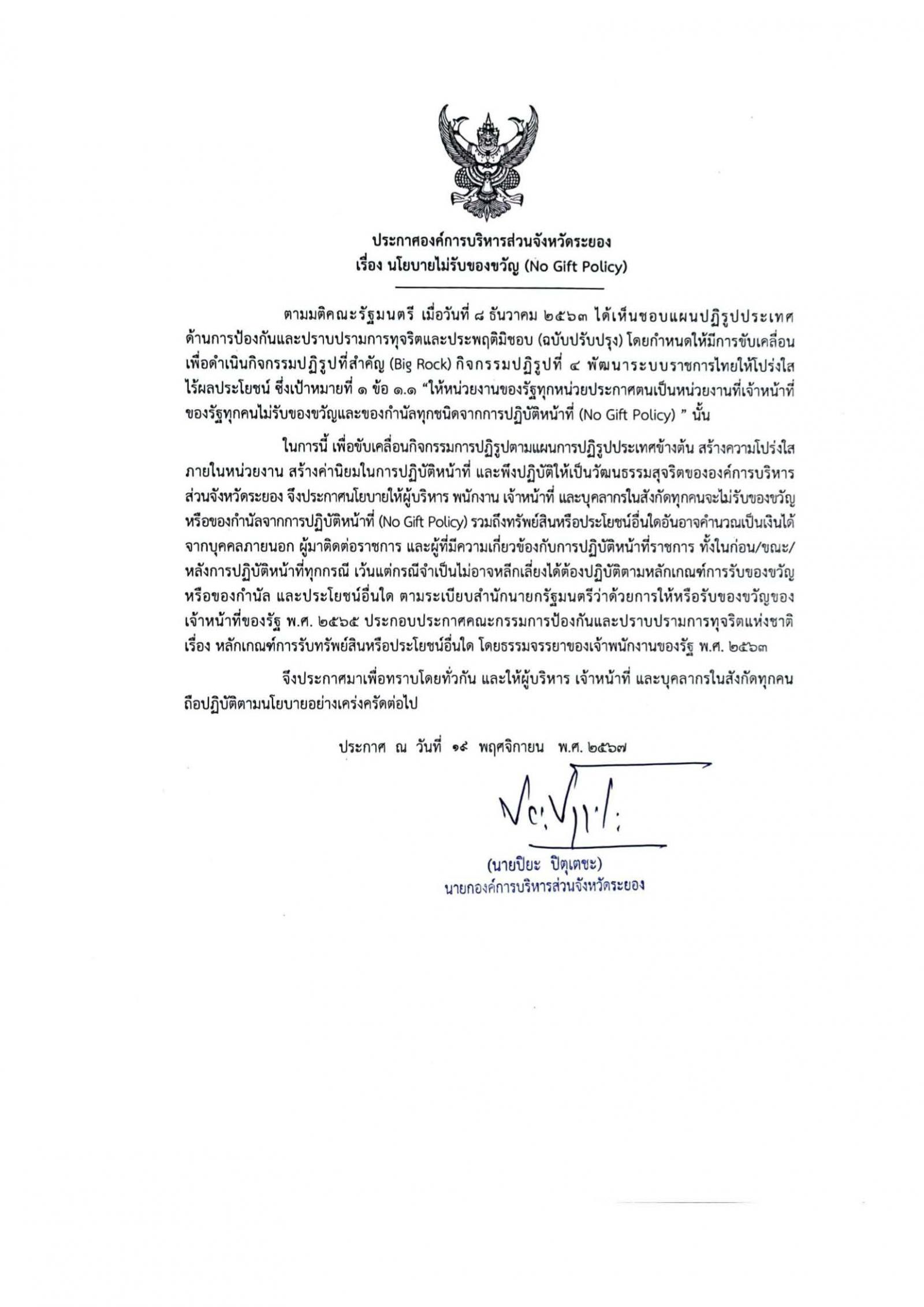 ประกาศองค์การบริหารส่วนจังหวัดระยอง เรื่อง นโยบายไม่รับของขวัญ (No Gift Policy)