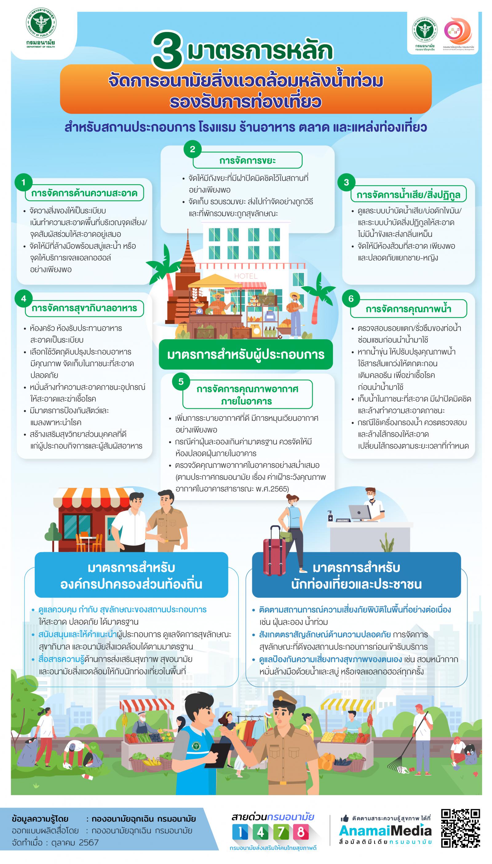 ด้วยจังหวัดระยอง มีหนังสือที่ รย ๐๐๒๓.๖/ว ๑๒๕๖ ลงวันที่ ๒๒ พฤศจิกายน ๒๕๖๗ แจ้งว่า กรมส่งเสริมการปกครองท้องถิ่นได้รับแจ้งกระทรวงสาธารณสุขว่า ได้ดำเนินการสนับสนุนภารกิจด้านการเฝ้าระวัง ประเมินจัดการความเสี่ยงทางสุขภาพและอนามัยสิ่งแวดล้อมในพื้นที่ประสบภัยน้ำท่วมอย่างต่อเนื่อง จึงได้จัดทำมาตรการด้านอนามัยสิ่งแวดล้อมหลังน้ำท่วมรองรับการท่องเที่ยวสำหรับสถานประกอบกิจการ เช่น โรงแรม ร้านอาหาร ตลาด และแหล่งท่องเที่ยวตลอดจนมาตรการสำหรับหน่วยงานราชการส่วนท้องถิ่นและประชาชนที่เข้าไปใช้บริการ