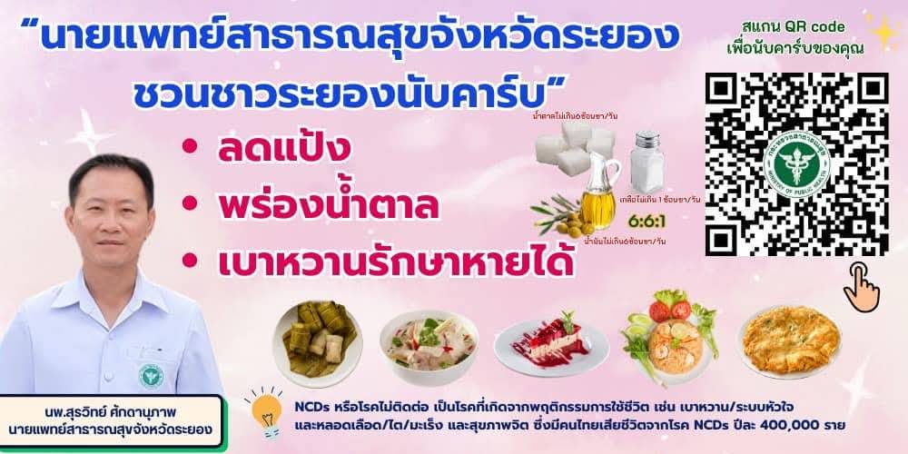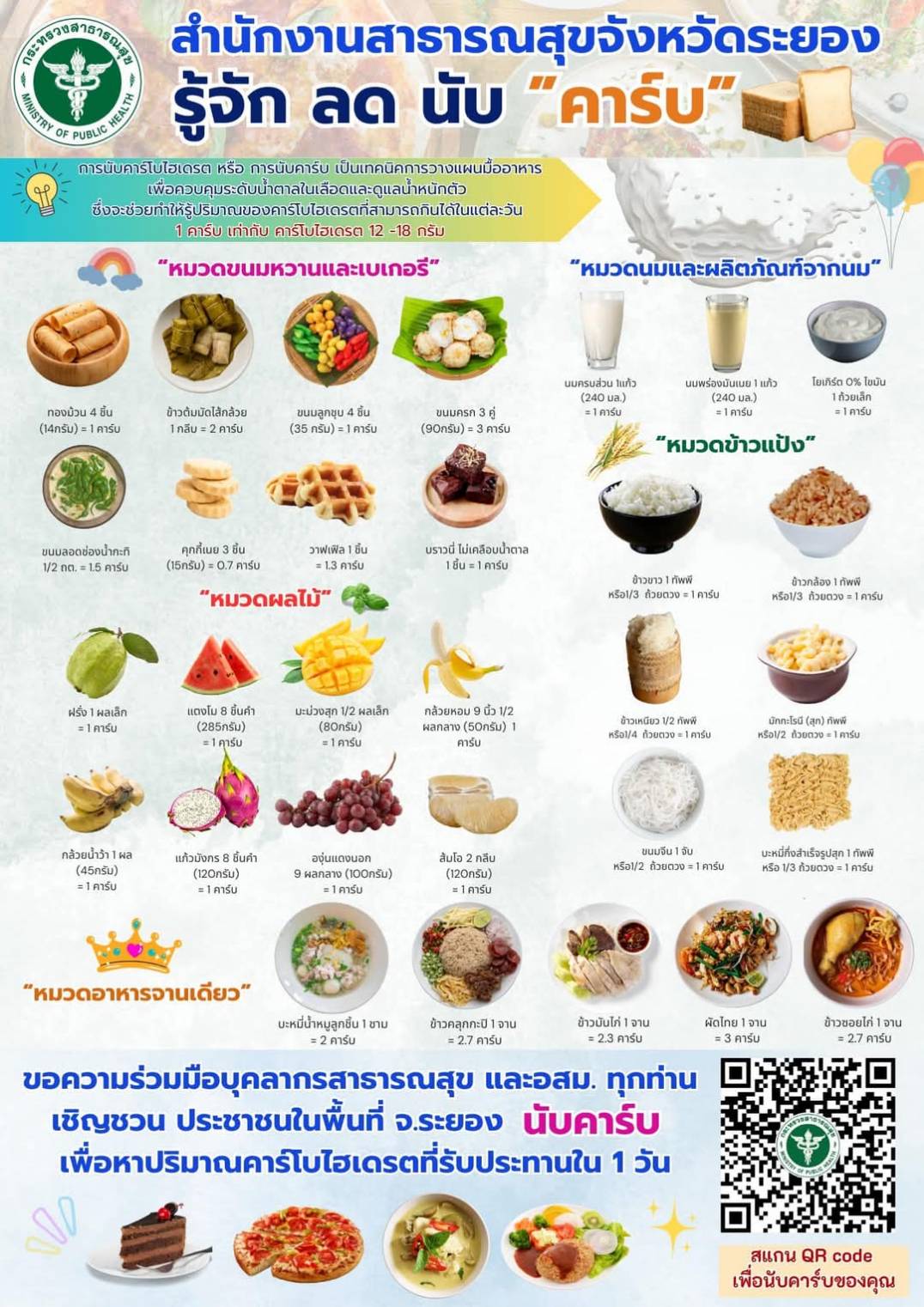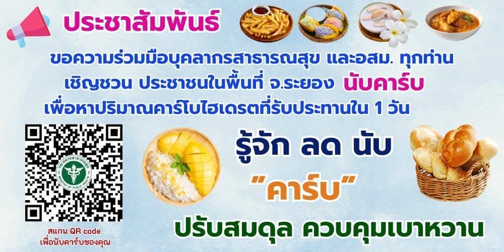 ด้วยสำนักงานสาธารณสุขจังหวัดระยอง มีหนังสือ ที่ รย ๐๐๓๓/ว ๖๖๕๑ ลงวันที่ ๑๕ พฤศจิกายน ๒๕๖๗ แจ้งว่า กระทรวงสาธารณสุข มีนโยบายให้คนไทยห่างไกลโรคไม่ติดต่อเรื้อรัง (Non-commuicable disease : NCDs) โดยการพัฒนาศักยภาพของเครือข่ายสาธารณสุขทุกภาคส่วน รวมถึงอสม. ในการส่งเสริม ป้องกัน และควบคุมโรคไม่ติดต่อเรื้อรัง (Non-commuicable disease : NCDs)ซึ่งเป็นปัญหาสำคัญของประเทศที่สามารถป้องกันได้ด้วยการปรับเปลี่ยนพฤติกรรมสุขภาพให้เหมาะสม ในการนี้ สำนักงานสาธารณสุขจังหวัดระยอง ขอความร่วมมือในการประชาสัมพันธ์ประชาชนในพื้นที่ ในการป้องกันโรคไม่ติดต่อเรื้อรัง (Non-commuicable disease : NCDs) โดยการนับคาร์บ เพื่อหาปริมาณคาร์โบไฮเดรต ที่รับประทานใน 1 วัน