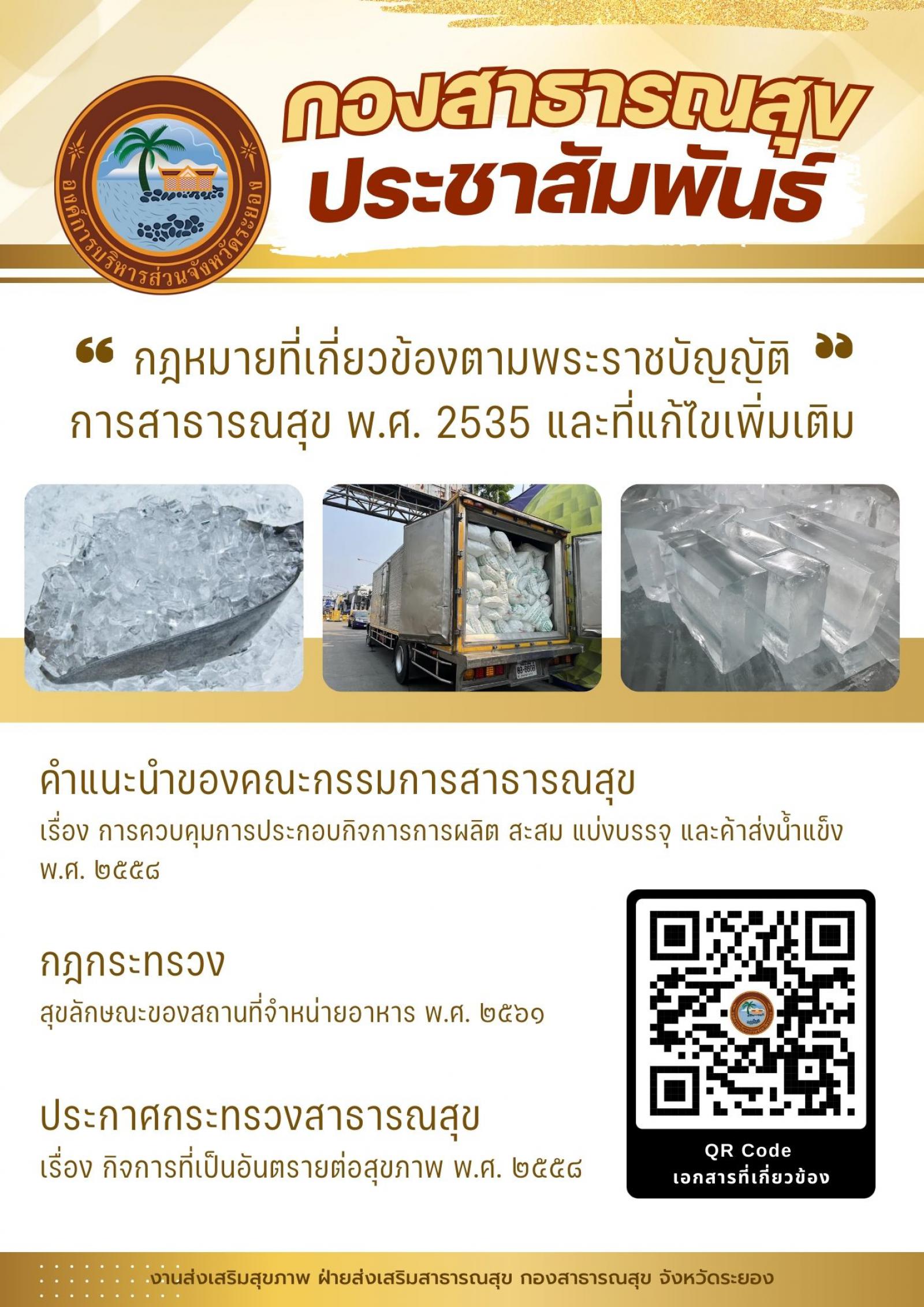 ด้วยจังหวัดระยอง มีหนังสือ.ที่.รย ๐๐๒๓.๖/ว๑๓๗๒ ลงวันที่ ๖ ธันวาคม ๒๕๖๗ แจ้งว่า สำนักงานสาธารณสุขจังหวัดระยอง พบสถานการณ์การระบาดของกลุ่มอาการอาหารเป็นพิษเป็นกลุ่มก้อนของนักเรียนในพื้นที่อำเภอแกลง จังหวัดระยอง ซึ่งมีผู้ป่วยถึง ๑,๕๘๗ (อัตราป่วย ๓๒.๗๔%) และผลการสอบสวนโรคเชื่อมโยงถึงความสะอาดตามหลักสุขาภิบาลอาหารและน้ำ โดยเฉพาะน้ำแข็งโม่จากผู้ประกอบการรายย่อย ประกอบกับผลตรวจทางห้องปฏิบัติการของกรมวิทยาศาสตร์การแพทย์พบเชื้อก่อโรคหลายชนิด เช่น เชื้อ Norovirus GI/GII, Enteropathogenic E.Coli (EPEC) ซึ่งเชื้อบางชนิดมีการปนเปื้อนระหว่างกระบวนการผลิต สะสม แบ่งบรรจุ ขนส่งน้ำแข็ง ในการนี้ สำนักงานสาธารณสุขจังหวัดระยอง จึงขอให้ประชาสัมพันธ์กฎหมายที่เกี่ยวข้องให้กับบุคลากรในหน่วยงาน สถานศึกษาในสังกัด และประชาชนในพื้นที่ทราบ เพื่อใช้เป็นแนวทางควบคุมการออกข้อกำหนดในเงื่อนไขการออกใบอนุญาตกิจการที่เป็นอันตรายต่อสุขภาพ ประเภทการผลิต สะสม แบ่งบรรจุ หรือขนส่งน้ำแข็ง สามารถดาวน์โหลดเอกสารได้ตาม QR Code ด้านล่าง