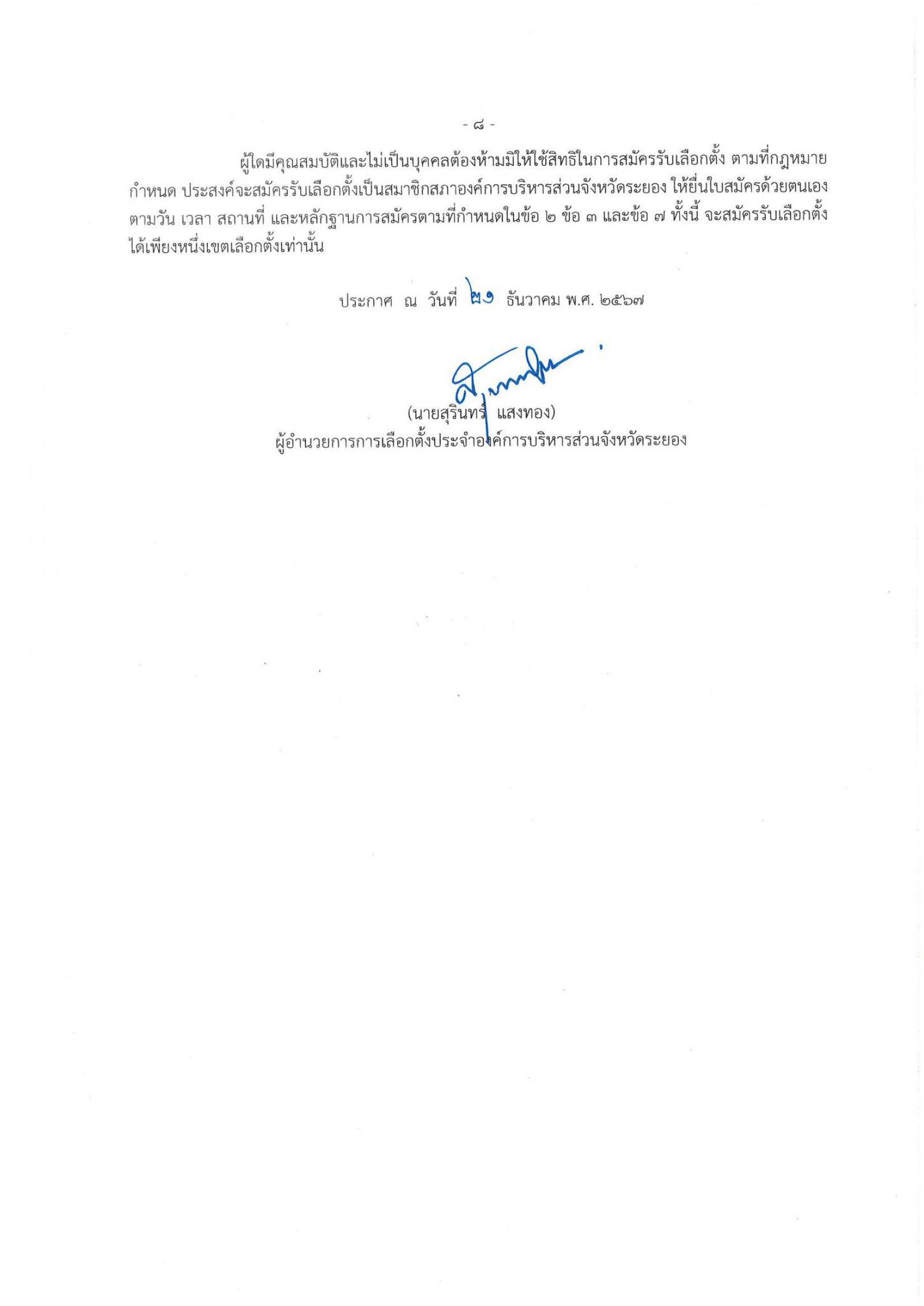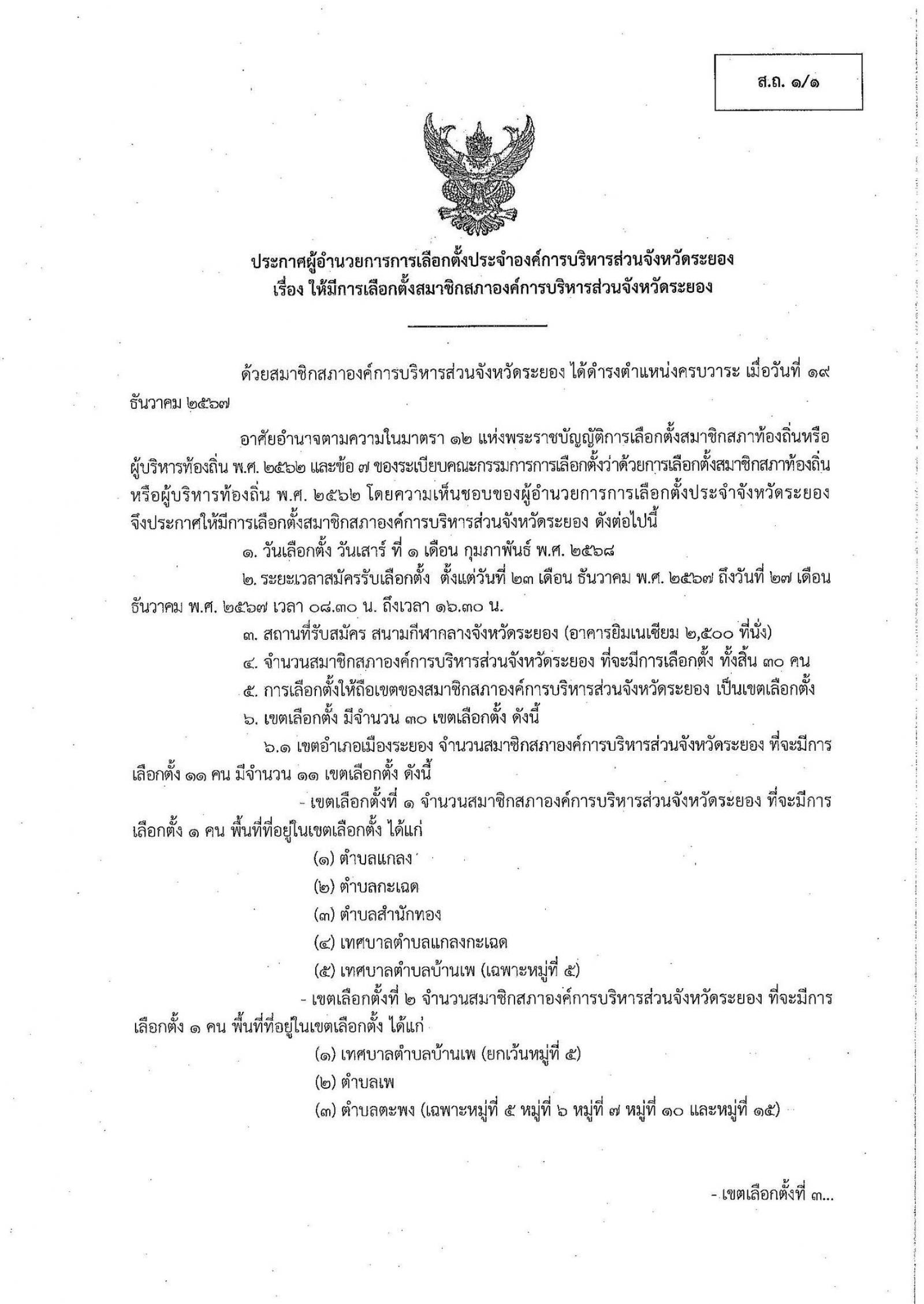 ประกาศผู้อำนวยการการเลือกตั้งประจำองค์การบริหารส่วนจังหวัดระยอง เรื่อง ให้มีการเลือกตั้งสมาชิกสภาองค์การบริหารส่วนจังหวัดระยอง ประกาศ ณ วันที่ 21 ธันวาคม พ.ศ. 2567