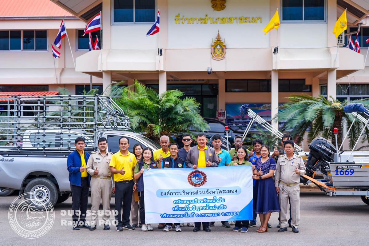 วันที่ 24 ธันวาคม 2567 เวลา 11.00 น. นางณิชาพร คุ้มท้วม ผู้อำนวยการกองทรัพยากรธรรมชาติและสิ่งแวดล้อม พร้อมด้วย เจ้าหน้าที่งานป้องกันและบรรเทาสาธารณภัย และเจ้าหน้าที่ที่เกี่ยวข้องร่วมสนับสนุนเรือ จำนวน 4 ลำ และน้ำมันสำหรับเป็นเชื้อเพลิงในการเติมเรือ เพื่อบำบัดน้ำเน่าเสีย โดยมี นายอานนท์ วงศ์แย้ม นายอำเภอเขาชะเมา เป็นผู้รับมอบ ณ ที่ว่าการอำเภอเขาชะเมา ตำบลห้วยทับมอญ อำเภอเขาชะเมา จังหวัดระยอง