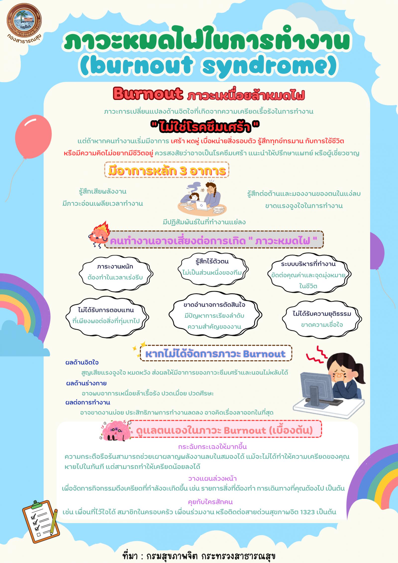ในปัจจุบันภาวะหมดไฟ หรือ burnout syndromes เป็นภาวะมลพิษทางอารมณ์ที่เกิดจากความเครียดสะสมในการทำงานมาระยะหนึ่ง จนเกิดเป็นความเหนื่อยล้าที่ส่งผลต่อสุขภาพใจและกาย องค์การอนามัยโลก (WHO) ได้ขึ้นทะเบียนให้การรับรองภาวะหมดไฟ ลงในมาตรฐานการจัดกลุ่มโรคระหว่างประเทศฉบับปรับปรุงครั้งที่ ๑๑ (๑๑ th Revision of the International Classification of Diseases ; ICD - ๑๑) โดยจัดเป็นภาวะความผิดปกติที่เกิดจากการทำงาน (Occupational phenomenon) ซึ่งถือว่าเป็นโรคใหม่ที่เกิดขึ้นกับผู้คนในยุคปัจจุบัน โดยเฉพาะในสภาพแวดล้อมการทำงานที่มีความเร่งรีบ กดดัน จนทำให้รู้สึกหมดพลัง หมดไฟ ไร้เรี่ยวแรง หมดแรงจูงใจในการทำงานและการใช้ชีวิต ซึ่งผู้ที่มีภาวะหมดไฟในการทำงานควรเข้ารับการรักษาและรับการบำบัดกับแพทย์เฉพาะทางที่มีประสบการณ์เพื่อให้ทราบถึงที่มาของปัญหา และร่วมกันหาแนวทางในการจัดการกับปัญหา อันเป็นที่มาของความเครียด รวมถึงขอเชิญชวนผู้ที่สนใจเข้าร่วมทำแบบประเมินภาวะหมดไฟในการทำงานด้วยตนเอง (Burnout Self - Test)