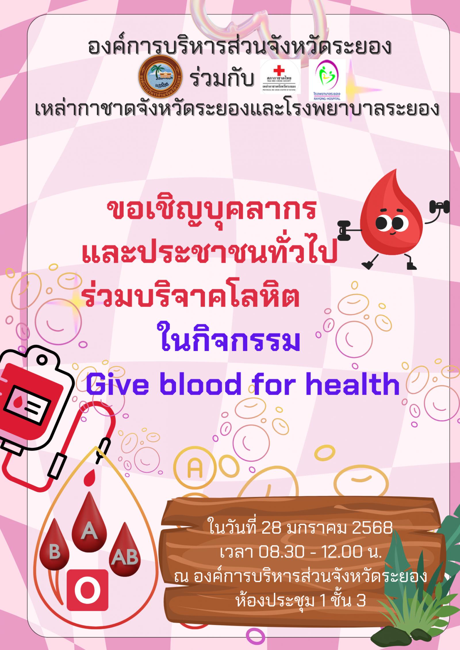 ด้วยกองสาธารณสุข จะดำเนินการจัดกิจกรรม Give blood for health เพื่อให้บุคลากรในสังกัดองค์การบริหารส่วนจังหวัดระยองได้บริจาคโลหิตให้กับผู้ป่วยที่ต้องการใช้โลหิตในการผ่าตัด หรือการรักษาพยาบาล รวมทั้งเพื่อให้เหล่ากาชาดจังหวัดระยองได้รับโลหิตเพียงพอต่อผู้ที่ต้องการโลหิตในวันที่ ๒๘ มกราคม ๒๕๖๘ เวลา ๐๘.๐๐ - ๑๒.๐๐ น. ณ ห้องประชุม ๑ ชั้น ๓ องค์การบริหารส่วนจังหวัดระยอง อำเภอเมืองระยอง จังหวัดระยอง