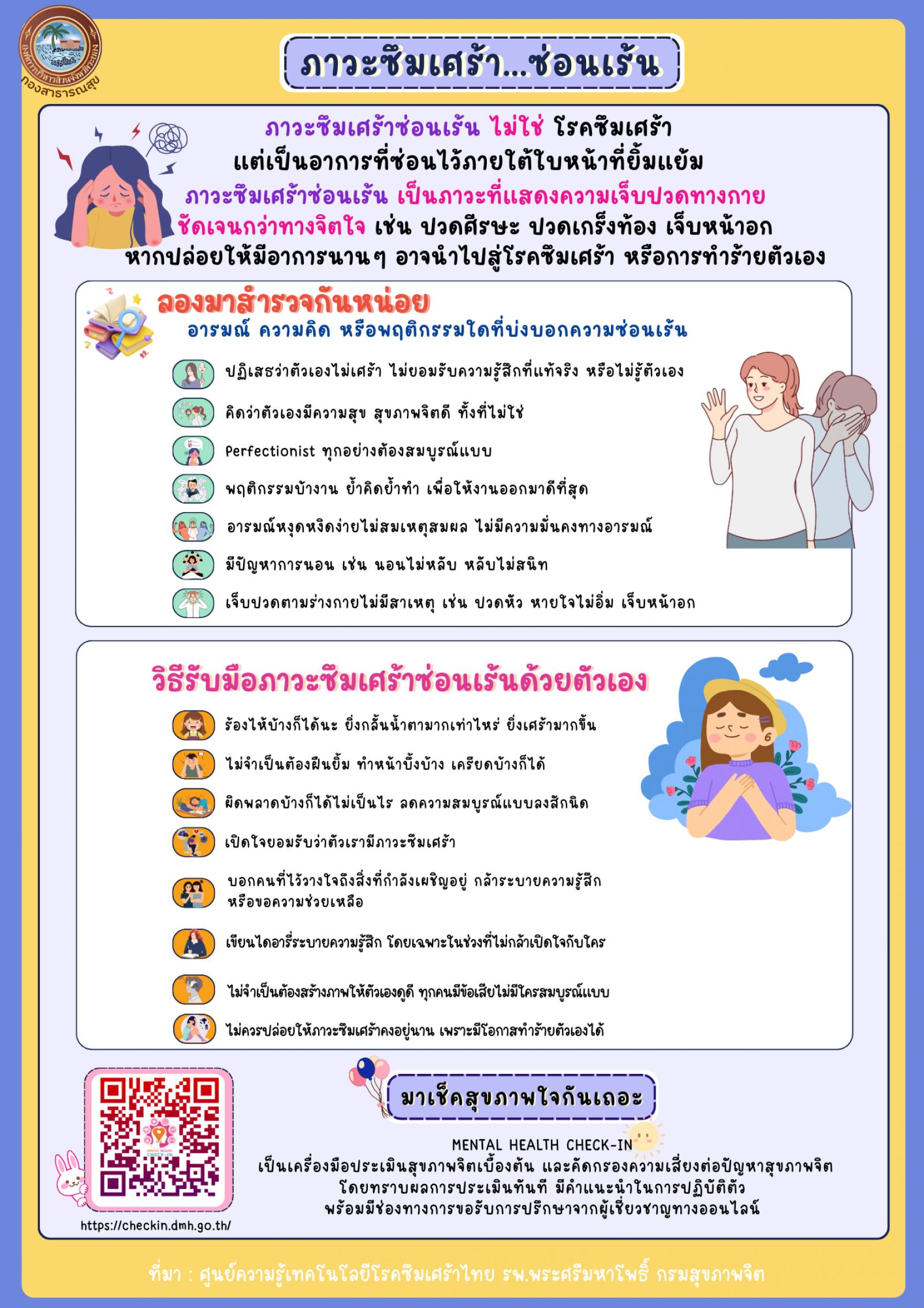 ด้วยกองสาธารณสุข ได้จัดทำสื่อภาวะซึมเศร้าซ่อนเร้น เพื่อประชาสัมพันธ์ให้ประชาชนทั่วไป ได้รับความรู้เกี่ยวกับภาวะซึมเศร้าซ่อนเร้น และการสำรวจภาวะซึมเศร้าซ่อนเร้น รวมทั้งวิธีรับมือภาวะซึมเศร้าซ่อนเร้นด้วยตนเอง ทำให้สามารถรับมือกับปัญหา