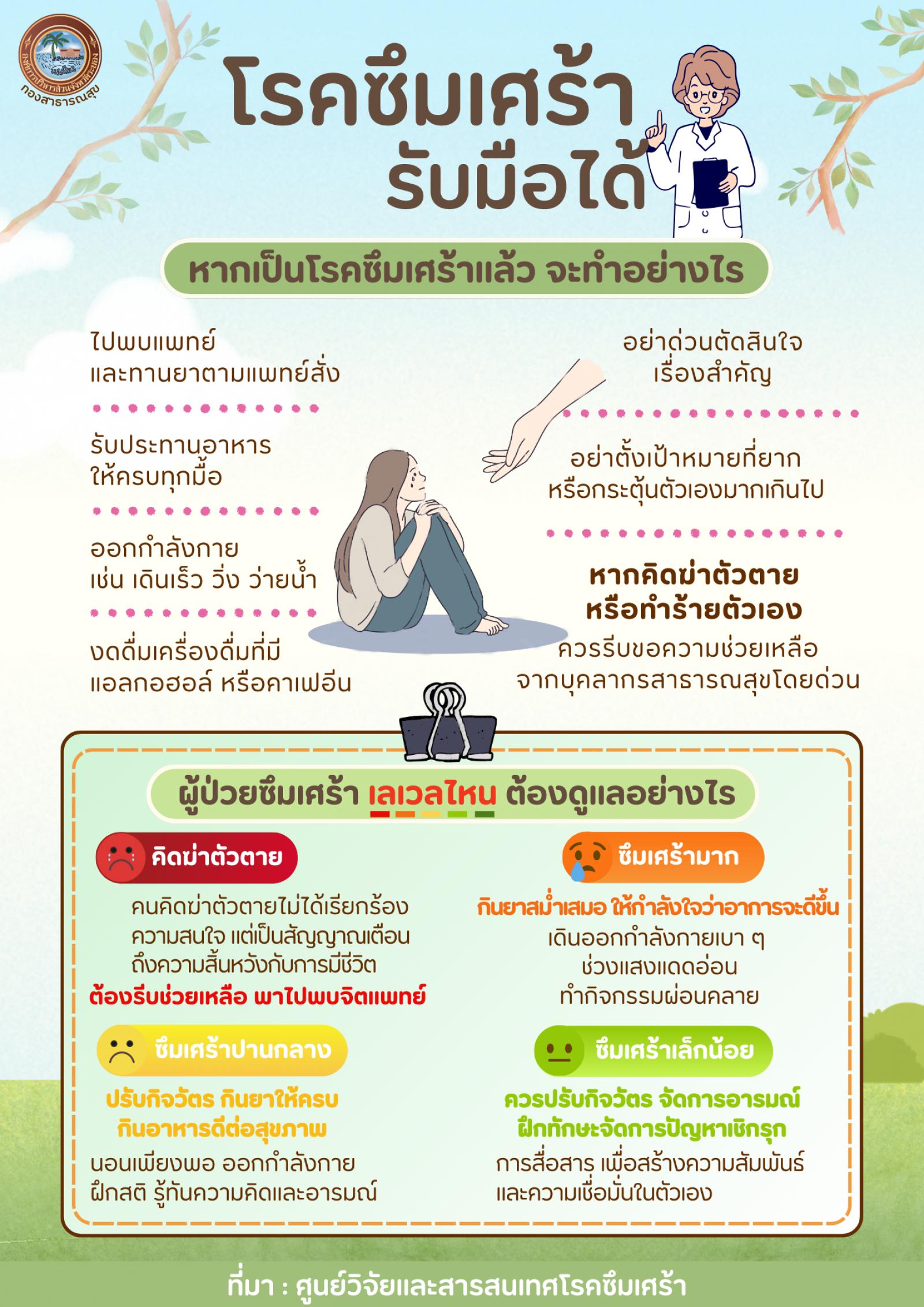 ด้วยกองสาธารณสุข ได้จัดทำสื่อโรคซึมเศร้ารับมือได้ เพื่อประชาสัมพันธ์ให้ประชาชนทั่วไป ได้รับความรู้และทำความเข้าใจเกี่ยวกับโรคซึมเศร้า ซึ่งสามารถเกิดขึ้นได้กับทุกคน และสามารถรักษาหายได้ ผู้ป่วยโรคซึมเศร้าแต่ละคนจะมีอาการและวิธีรักษาที่แตกต่างกันบุคคลรอบข้างต้องทำความเข้าใจและมีวิธีปฏิบัติเพื่อช่วยให้ผู้ป่วยมีกำลังใจดีขึ้น นอกเหนือจากการกินยาเป็นประจำและการปรับกิจวัตรประจำวันแล้ว การส่งเสริมและกระตุ้นให้ผู้ป่วยออกกำลังกายก็ช่วยเยียวยาจิตใจของผู้ป่วยให้ดีขึ้นได้ รายละเอียดตามเอกสารที่แนบมาพร้อมนี้