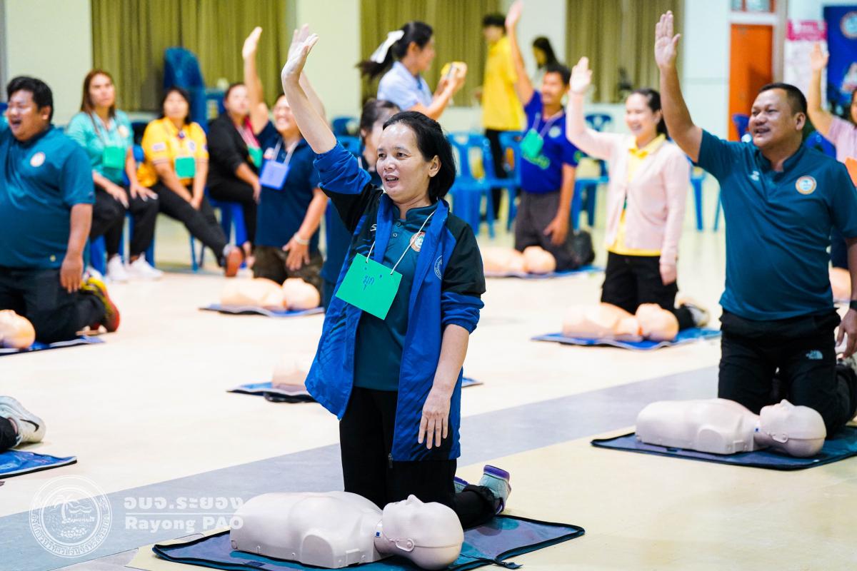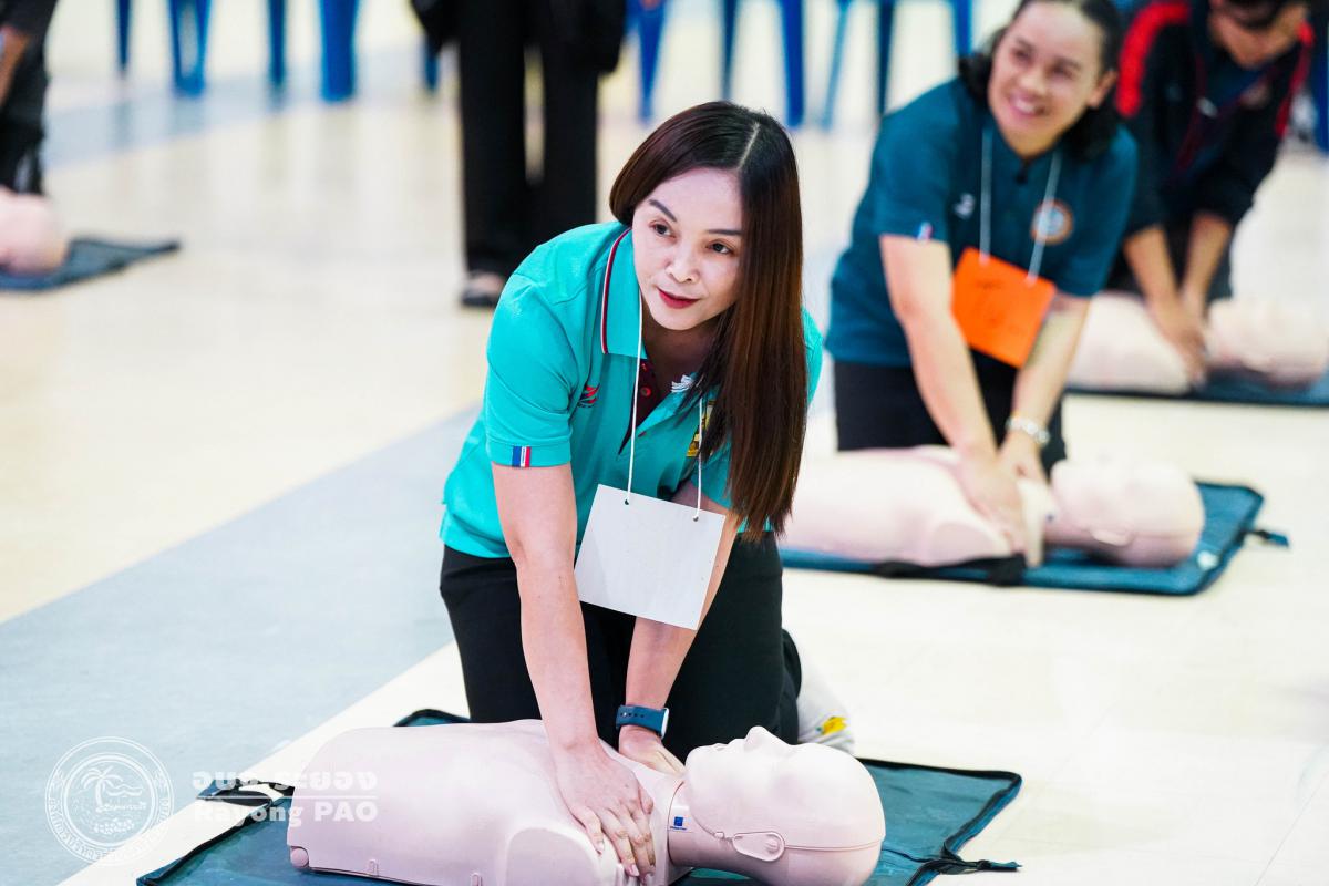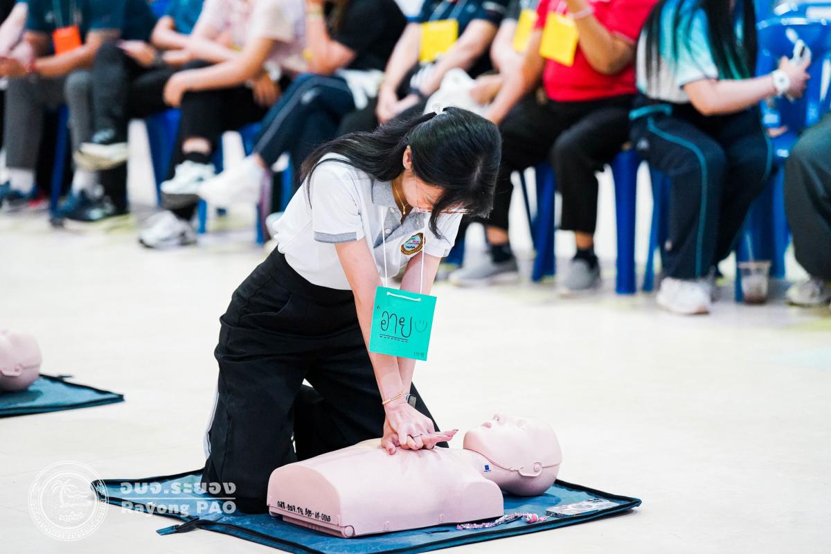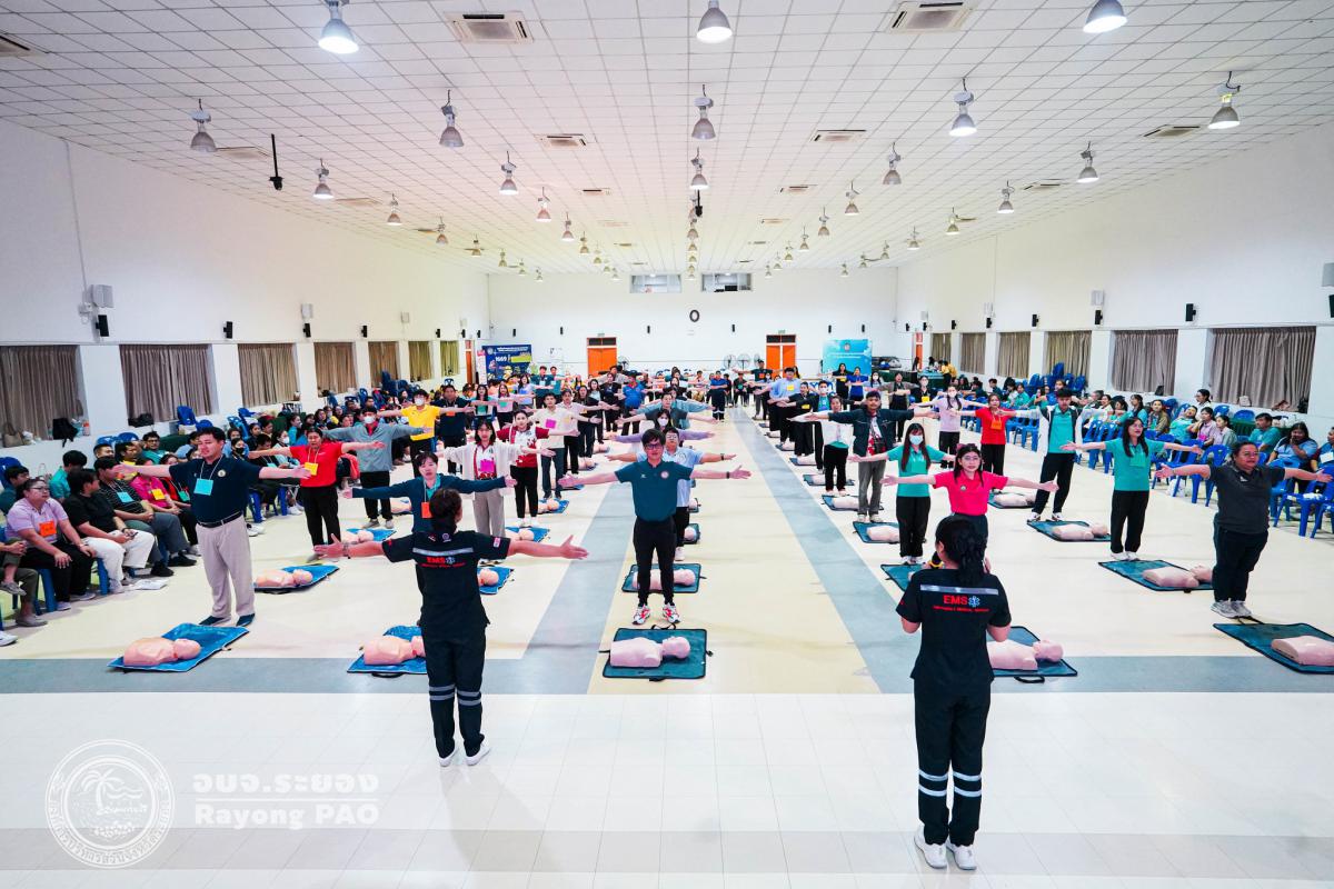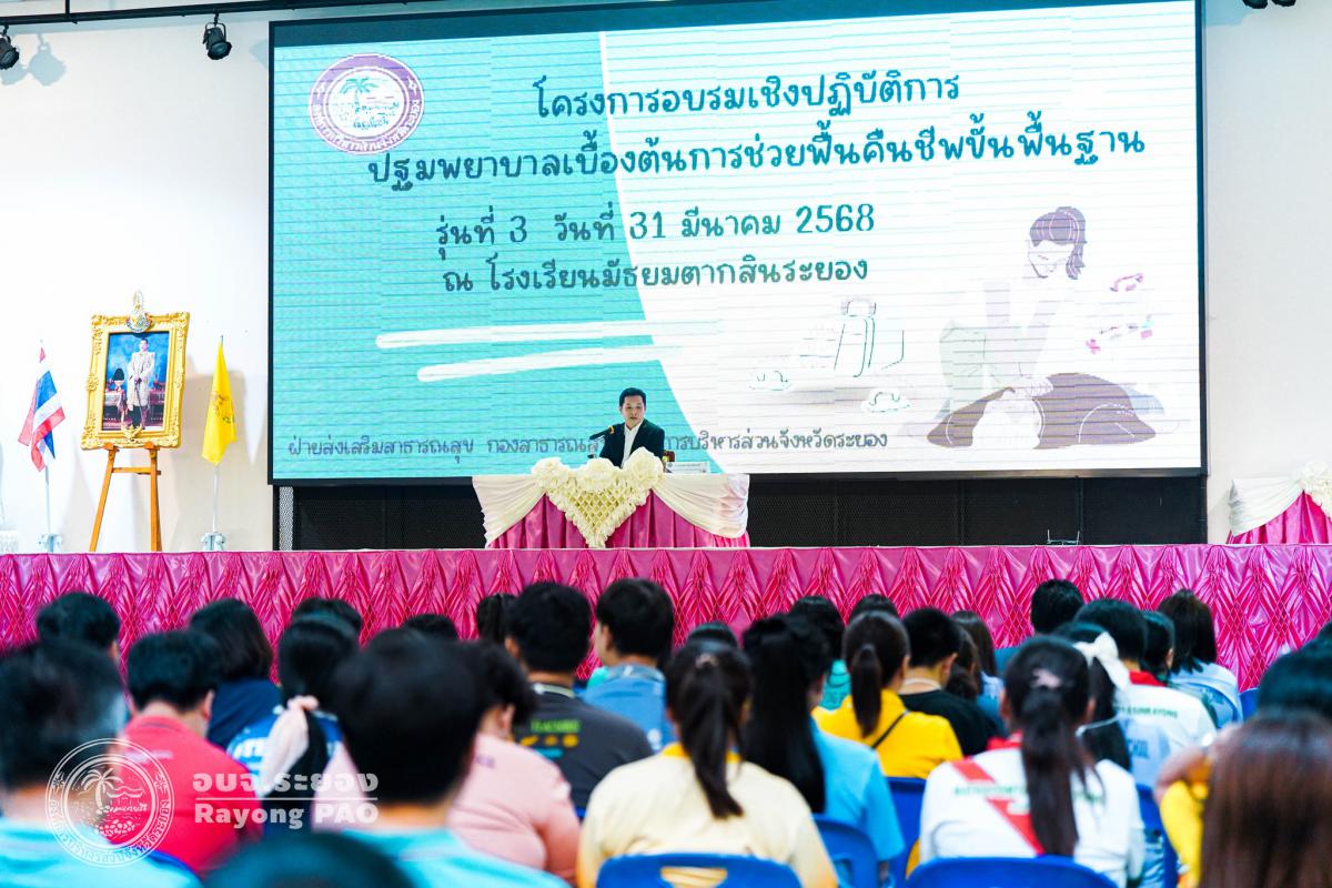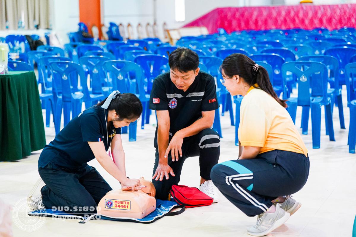 วันที่ 31 มีนาคม 2568 เวลา 08.00 น. กองสาธารณสุข จัดโครงการอบรมเชิงปฏิบัติการปฐมพยาบาลเบื้องต้นและการช่วยฟื้นคืนชีพขั้นพื้นฐาน รุ่นที่ 3 เพื่อให้ครูและบุคลากรทางการศึกษาได้รับความรู้รวมถึงทักษะในการปฐมพยาบาลเบื้องต้นและการช่วยชีวิตอย่างถูกต้อง โดยมี นายกิตติ เกียรติ์มนตรี รองนายกองค์การบริหารส่วนจังหวัดระยอง (1) เป็นประธานในพิธีเปิดโครงการฯ พร้อมด้วย นายสุริยะ ศิริวัฒน์ ผู้อำนวยการกองสาธารณสุข เป็นผู้กล่าววัตถุประสงค์ของการจัดโครงการฯ และเจ้าหน้าที่ที่เกี่ยวข้องเข้าร่วมโครงการฯ โดยพร้อมเพรียงกัน ซึ่งภายในโครงการฯ มีการบรรยายให้ความรู้ในหัวข้อ “การแจ้งเหตุฉุกเฉินและหลักประกันการประเมินผู้ป่วยเบื้องต้น” พร้อมสาธิตวิธีการช่วยฟื้นคืนชีพขั้นพื้นฐาน (CPR) ร่วมกับการใช้เครื่องกระตุกหัวใจด้วยไฟฟ้าชนิดอัตโนมัติ (AED) “การแก้ทางเดินหายใจถูกอุดกลั้น (Choking) “การปฐมพยาบาลเบื้องต้น กรณีมีแผล/การแตกหักของกระดูก และในช่วงบ่ายได้แบ่งกลุ่มฝึกปฏิบัติจำนวน 6 กลุ่ม ณ โรงเรียนมัธยมตากสินระยอง
