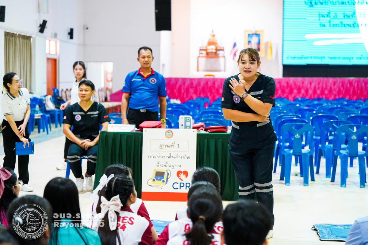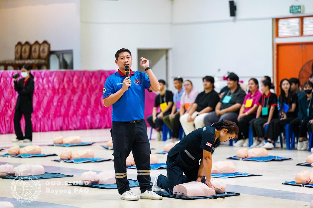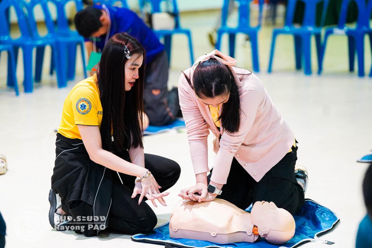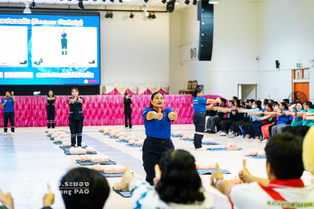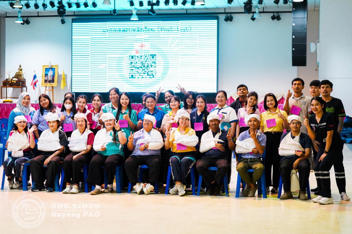วันที่ 31 มีนาคม 2568 เวลา 08.00 น. กองสาธารณสุข จัดโครงการอบรมเชิงปฏิบัติการปฐมพยาบาลเบื้องต้นและการช่วยฟื้นคืนชีพขั้นพื้นฐาน รุ่นที่ 3 เพื่อให้ครูและบุคลากรทางการศึกษาได้รับความรู้รวมถึงทักษะในการปฐมพยาบาลเบื้องต้นและการช่วยชีวิตอย่างถูกต้อง โดยมี นายกิตติ เกียรติ์มนตรี รองนายกองค์การบริหารส่วนจังหวัดระยอง (1) เป็นประธานในพิธีเปิดโครงการฯ พร้อมด้วย นายสุริยะ ศิริวัฒน์ ผู้อำนวยการกองสาธารณสุข เป็นผู้กล่าววัตถุประสงค์ของการจัดโครงการฯ และเจ้าหน้าที่ที่เกี่ยวข้องเข้าร่วมโครงการฯ โดยพร้อมเพรียงกัน ซึ่งภายในโครงการฯ มีการบรรยายให้ความรู้ในหัวข้อ “การแจ้งเหตุฉุกเฉินและหลักประกันการประเมินผู้ป่วยเบื้องต้น” พร้อมสาธิตวิธีการช่วยฟื้นคืนชีพขั้นพื้นฐาน (CPR) ร่วมกับการใช้เครื่องกระตุกหัวใจด้วยไฟฟ้าชนิดอัตโนมัติ (AED) “การแก้ทางเดินหายใจถูกอุดกลั้น (Choking) “การปฐมพยาบาลเบื้องต้น กรณีมีแผล/การแตกหักของกระดูก และในช่วงบ่ายได้แบ่งกลุ่มฝึกปฏิบัติจำนวน 6 กลุ่ม ณ โรงเรียนมัธยมตากสินระยอง