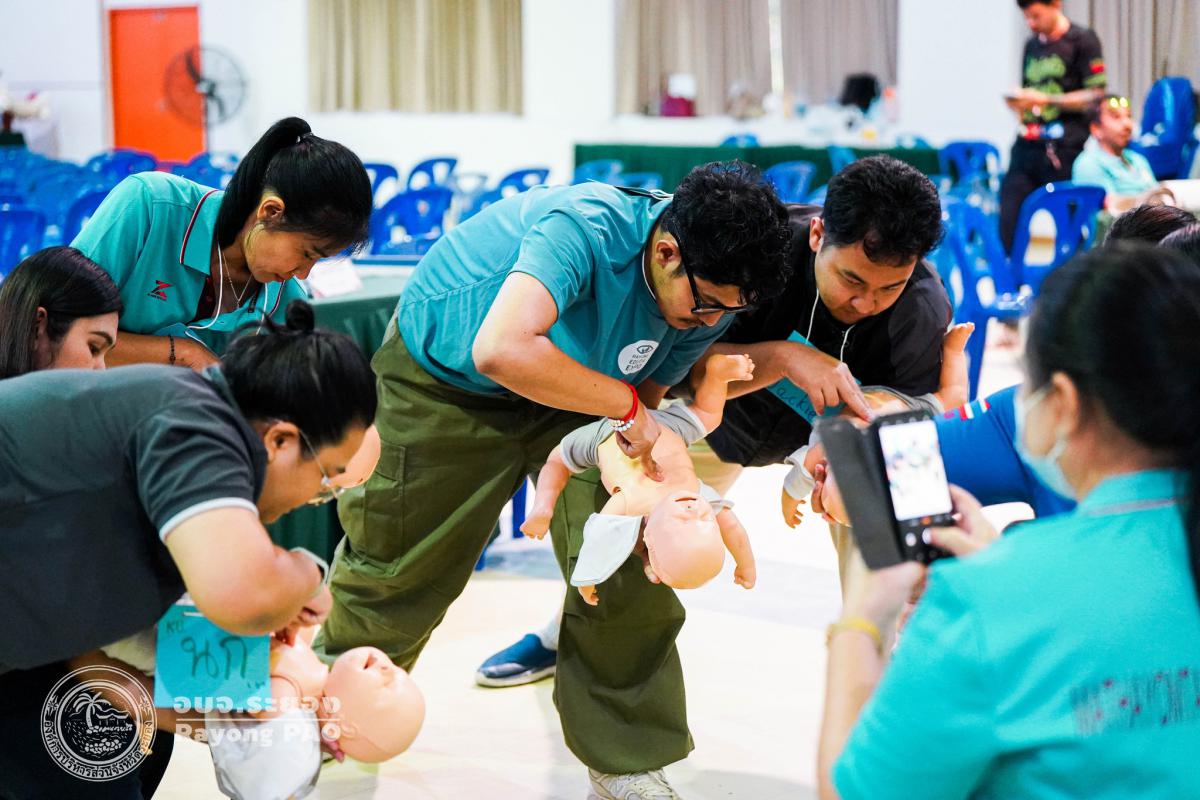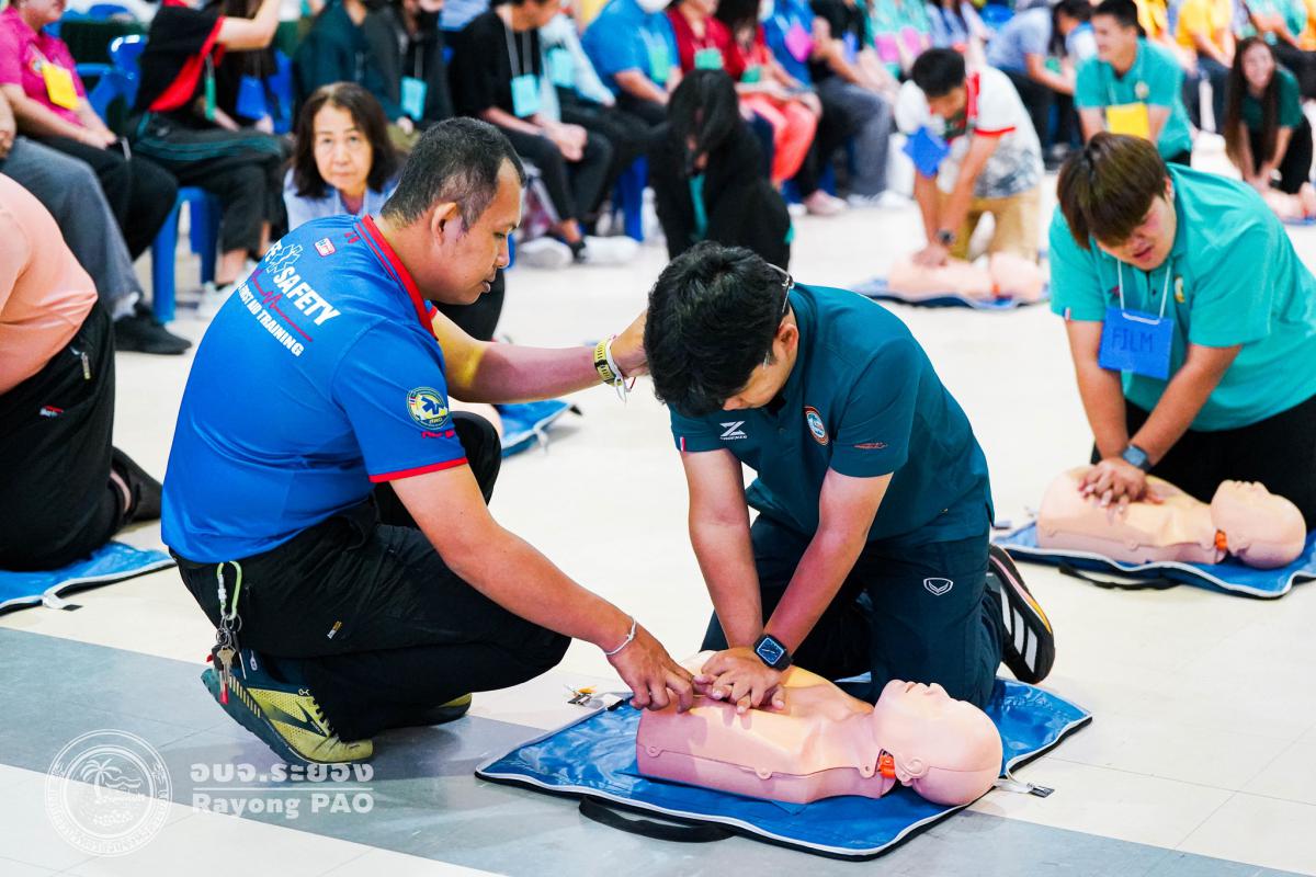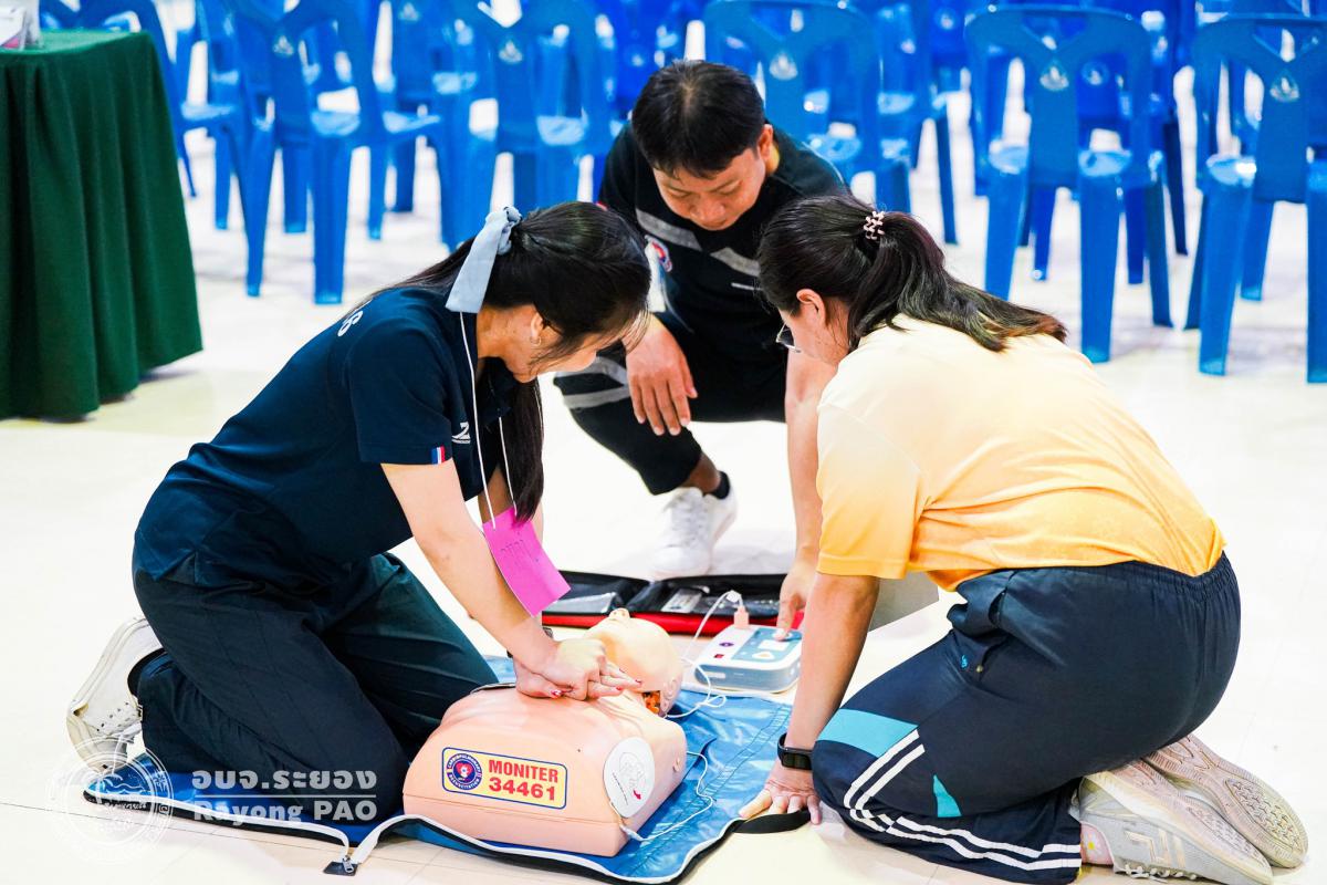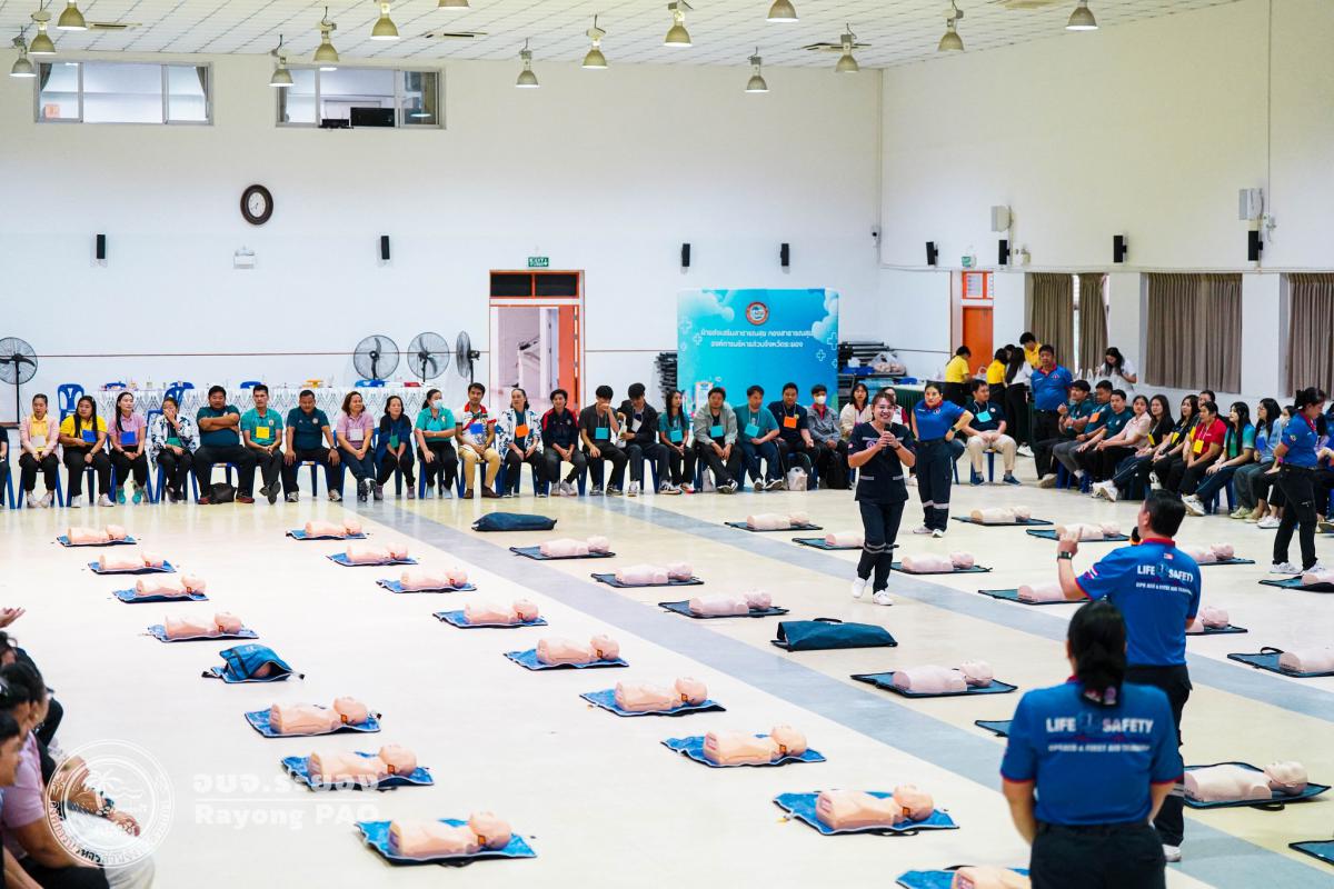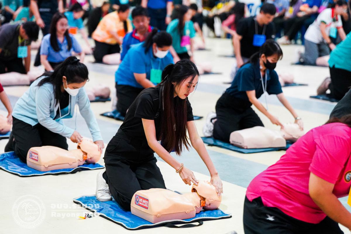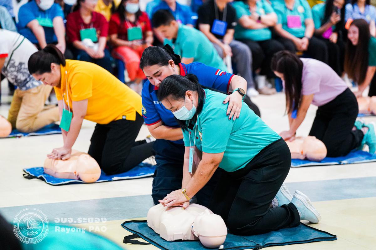 วันที่ 31 มีนาคม 2568 เวลา 08.00 น. กองสาธารณสุข จัดโครงการอบรมเชิงปฏิบัติการปฐมพยาบาลเบื้องต้นและการช่วยฟื้นคืนชีพขั้นพื้นฐาน รุ่นที่ 3 เพื่อให้ครูและบุคลากรทางการศึกษาได้รับความรู้รวมถึงทักษะในการปฐมพยาบาลเบื้องต้นและการช่วยชีวิตอย่างถูกต้อง โดยมี นายกิตติ เกียรติ์มนตรี รองนายกองค์การบริหารส่วนจังหวัดระยอง (1) เป็นประธานในพิธีเปิดโครงการฯ พร้อมด้วย นายสุริยะ ศิริวัฒน์ ผู้อำนวยการกองสาธารณสุข เป็นผู้กล่าววัตถุประสงค์ของการจัดโครงการฯ และเจ้าหน้าที่ที่เกี่ยวข้องเข้าร่วมโครงการฯ โดยพร้อมเพรียงกัน ซึ่งภายในโครงการฯ มีการบรรยายให้ความรู้ในหัวข้อ “การแจ้งเหตุฉุกเฉินและหลักประกันการประเมินผู้ป่วยเบื้องต้น” พร้อมสาธิตวิธีการช่วยฟื้นคืนชีพขั้นพื้นฐาน (CPR) ร่วมกับการใช้เครื่องกระตุกหัวใจด้วยไฟฟ้าชนิดอัตโนมัติ (AED) “การแก้ทางเดินหายใจถูกอุดกลั้น (Choking) “การปฐมพยาบาลเบื้องต้น กรณีมีแผล/การแตกหักของกระดูก และในช่วงบ่ายได้แบ่งกลุ่มฝึกปฏิบัติจำนวน 6 กลุ่ม ณ โรงเรียนมัธยมตากสินระยอง