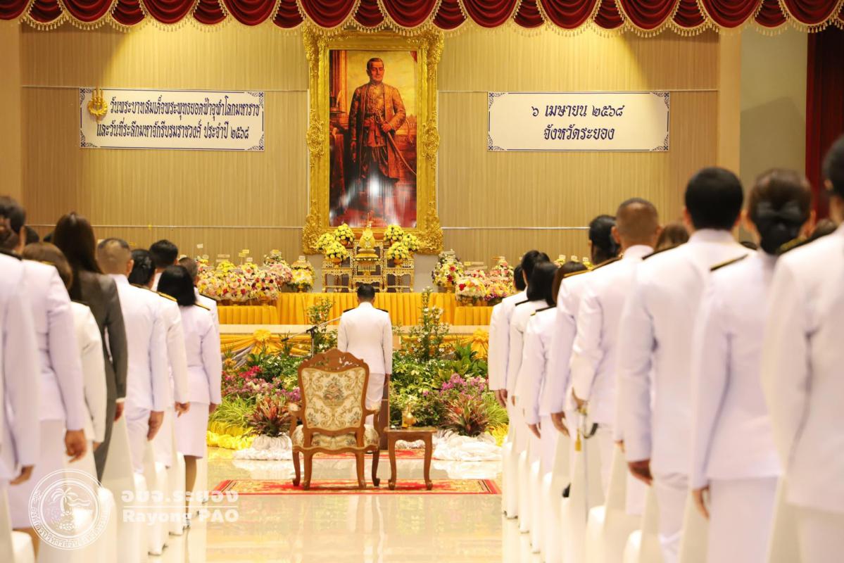 วันที่ 6 เมษายน 2568 เวลา 08.00 น. องค์การบริหารส่วนจังหวัดระยอง นำโดย นางนวลฉวี เสียงประเสริฐ ผู้อำนวยการกองคลัง พร้อมด้วย ข้าราชการองค์การบริหารส่วนจังหวัดระยอง เข้าร่วมพิธีถวายเครื่องราชสักการะพระบรมฉายาสาทิสลักษณ์พระบาทสมเด็จพระพุทธยอดฟ้าจุฬาโลกมหาราช เพื่อแสดงความจงรักภักดี และน้อมรำลึกในพระมหากรุณาธิคุณแห่งพระบรมราชวงศ์จักรี โดยมีนายไตรภพ วงศ์ไตรรัตน์ ผู้ว่าราชการจังหวัดระยอง เป็นประธานในพิธี นำผู้แทนส่วนราชการองค์กรต่างๆ กล่าวคำถวายอาศิรวาทราชสดุดี ถวายภัตตาหารและจตุปัจจัยไทยธรรมแด่พระสงฆ์ จำนวน 10 รูป ณ หอประชุมศูนย์ราชการจังหวัดระยอง