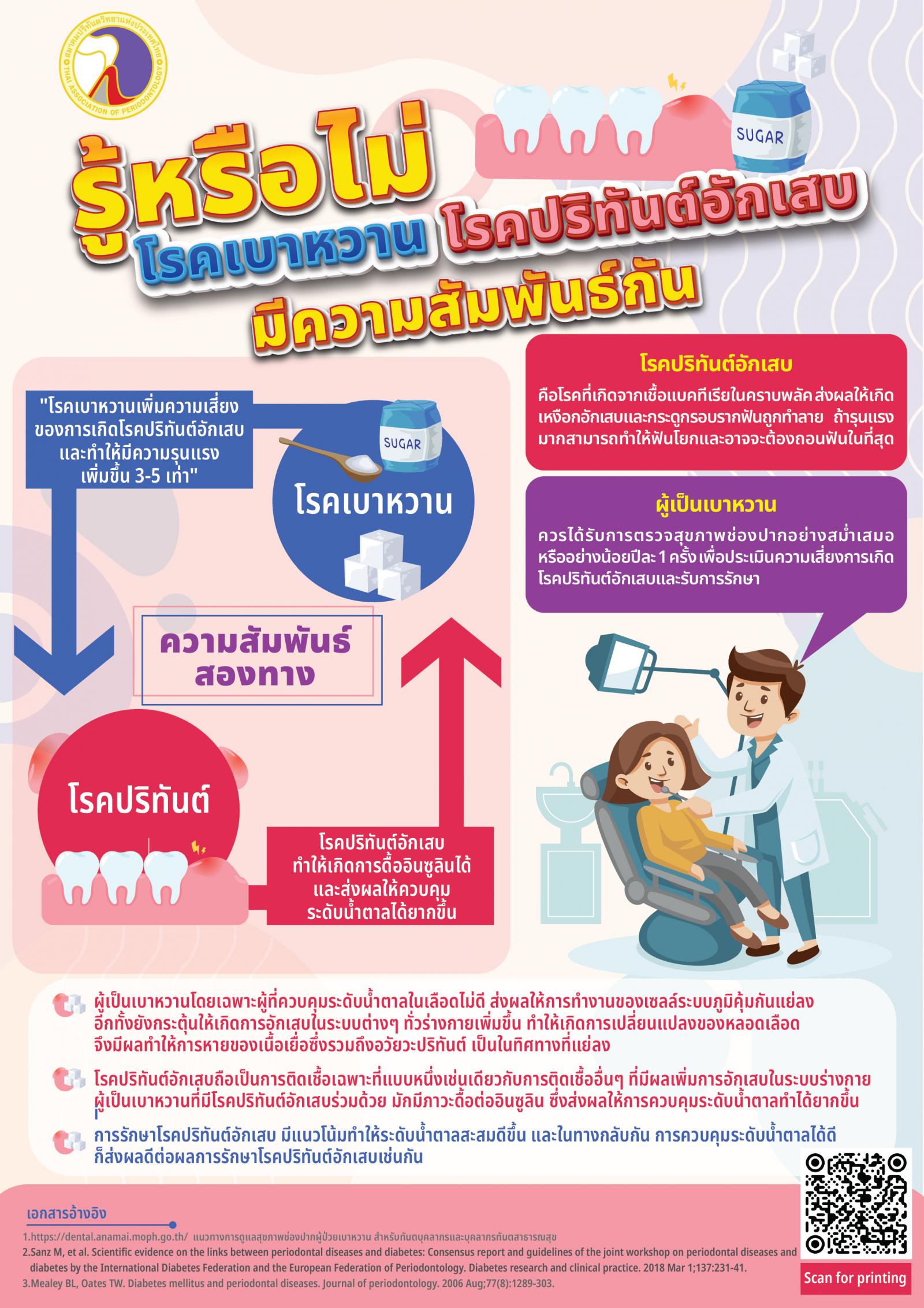 ด้วยสำนักงานสาธารณสุขจังหวัดระยอง มีหนังสือที่ รย ๐๐๓๓/ว๑๘๓๔ ลงวันที่ ๒๑ มีนาคม ๒๕๖๘ แจ้งว่า สมาคมปริทันตวิทยาแห่งประเทศไทย ได้จัดทำสื่อประชาสัมพันธ์เกี่ยวกับความสัมพันธ์ของโรคปริทันต์อักเสบกับโรคเบาหวาน โดยมีวัตถุประสงค์เพื่อเผยแพร่ความรู้ทางด้านปริทันตวิทยาแก่ประชาชนทั่วไป โดยเฉพาะในเรื่องความสัมพันธ์ของโรคเบาหวานกับโรคปริทันต์อักเสบ เพื่อเป็นแนวทางในการดูแลตนเองของผู้เป็นเบาหวาน รวมทั้งประชาชนทั่วไป ในการนี้ สำนกงานสาธารณสุขจังหวัดระยอง จึงขอประชาสัมพันธ์เรื่องโรคเบาหวานและโรคปริทันต์อักเสบ ผ่านโปสเตอร์ประชาสัมพันธ์ รายละเอียดตามเอกสารที่แนบมาพร้อมนี้