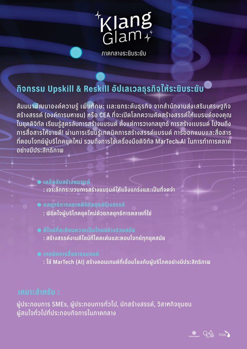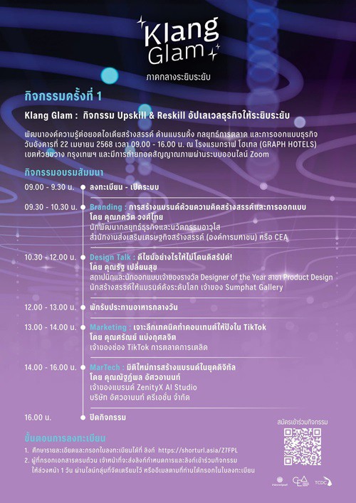 ประชาสัมพันธ์กิจกรรม Upskill & Reskill โครงการแบรนดิ้งผลิตภัณฑ์ภูมิภาคกลางส่งเสริมซอฟต์พาวเวอร์ไทย "Klang Glam (ภาคกลางระยิบระยับ) 2025"