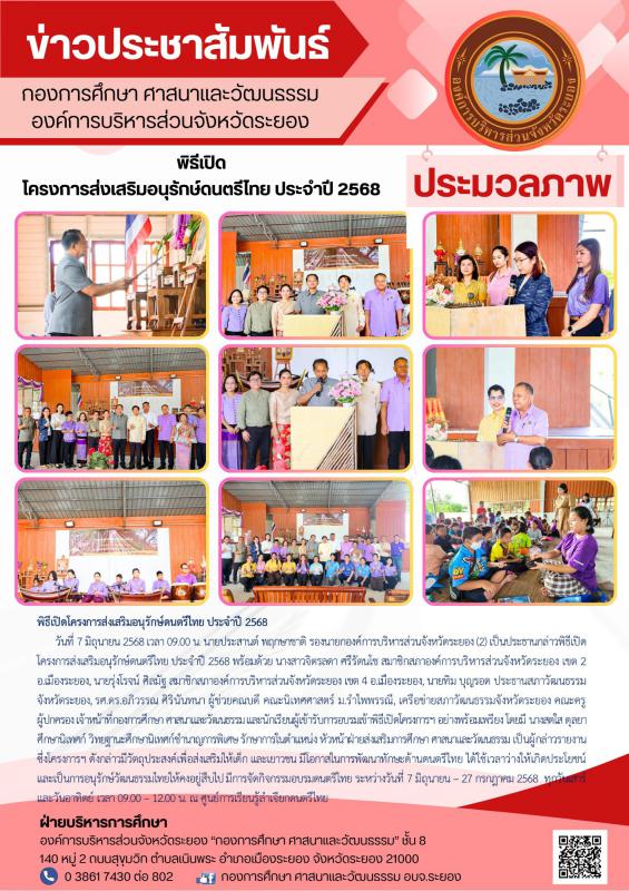 วันที่ 7 มิถุนายน 2568 เวลา 09.00 น. นายประสานต์ พฤกษาชาติ รองนายกองค์การบริหารส่วนจังหวัดระยอง (2) เป็นประธานกล่าวพิธีเปิดโครงการส่งเสริมอนุรักษ์ดนตรีไทย ประจำปี 2568 พร้อมด้วย นางสาวจิตรลดา ศรีรัตนโช สมาชิกสภาองค์การบริหารส่วนจังหวัดระยอง เขต 2 อ.เมืองระยอง, นายรุ่งโรจน์ ศิลมัฐ สมาชิกสภาองค์การบริหารส่วนจังหวัดระยอง เขต 4 อ.เมืองระยอง, นายทิม บุญรอด ประธานสภาวัฒนธรรมจังหวัดระยอง, รศ.ดร.อภิวรรณ ศิรินันทนา ผู้ช่วยคณบดี คณะนิเทศศาสตร์ ม.รำไพพรรณี, เครือข่ายสภาวัฒนธรรมจังหวัดระยอง คณะครู ผู้ปกครอง เจ้าหน้าที่กองการศึกษา ศาสนาและวัฒนธรรม และนักเรียนผู้เข้ารับการอบรมเข้าพิธีเปิดโครงการฯ อย่างพร้อมเพรียง โดยมี นางสดใส ดุลยา ศึกษานิเทศก์ วิทยฐานะศึกษานิเทศก์ชำนาญการพิเศษ รักษาการในตำแหน่ง หัวหน้าฝ่ายส่งเสริมการศึกษา ศาสนาและวัฒนธรรม เป็นผู้กล่าวรายงาน ซึ่งโครงการฯ ดังกล่าวมีวัตถุประสงค์เพื่อส่งเสริมให้เด็ก และเยาวชน มีโอกาสในการพัฒนาทักษะด้านดนตรีไทย ได้ใช้เวลาว่างให้เกิดประโยชน์ และเป็นการอนุรักษ์วัฒนธรรมไทยให้คงอยู่สืบไป มีการจัดกิจกรรมอบรมดนตรีไทย ระหว่างวันที่ 7 มิถุนายน – 27 กรกฎาคม 2568 ทุกวันเสาร์และวันอาทิตย์ เวลา 09.00 – 12.00 น. ณ ศูนย์การเรียนรู้ลำเจียกดนตรีไทย