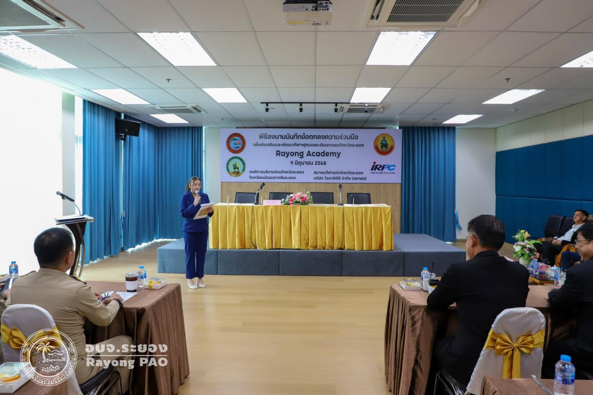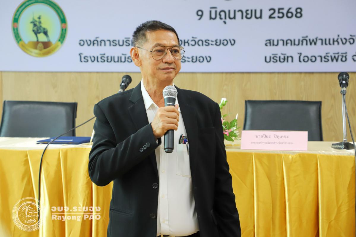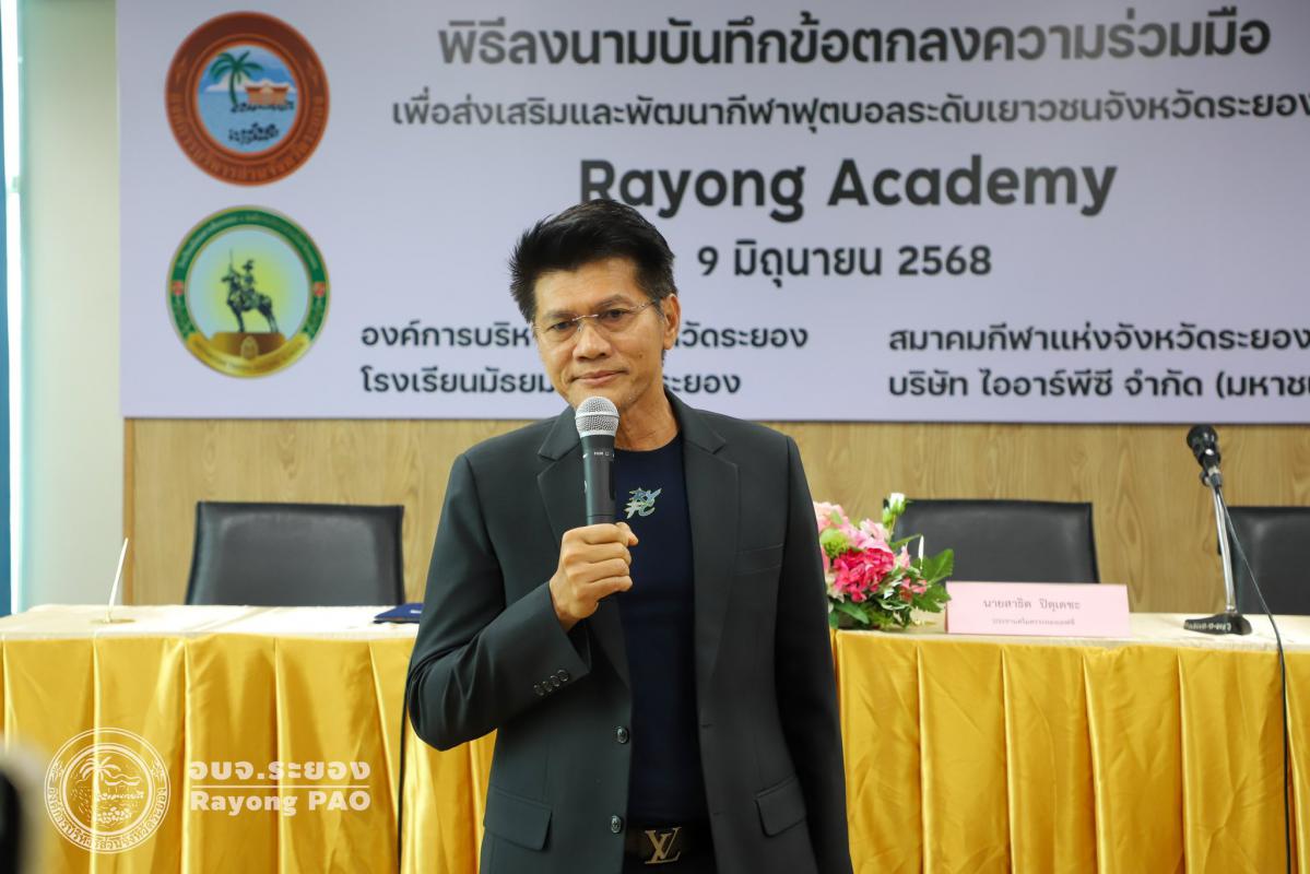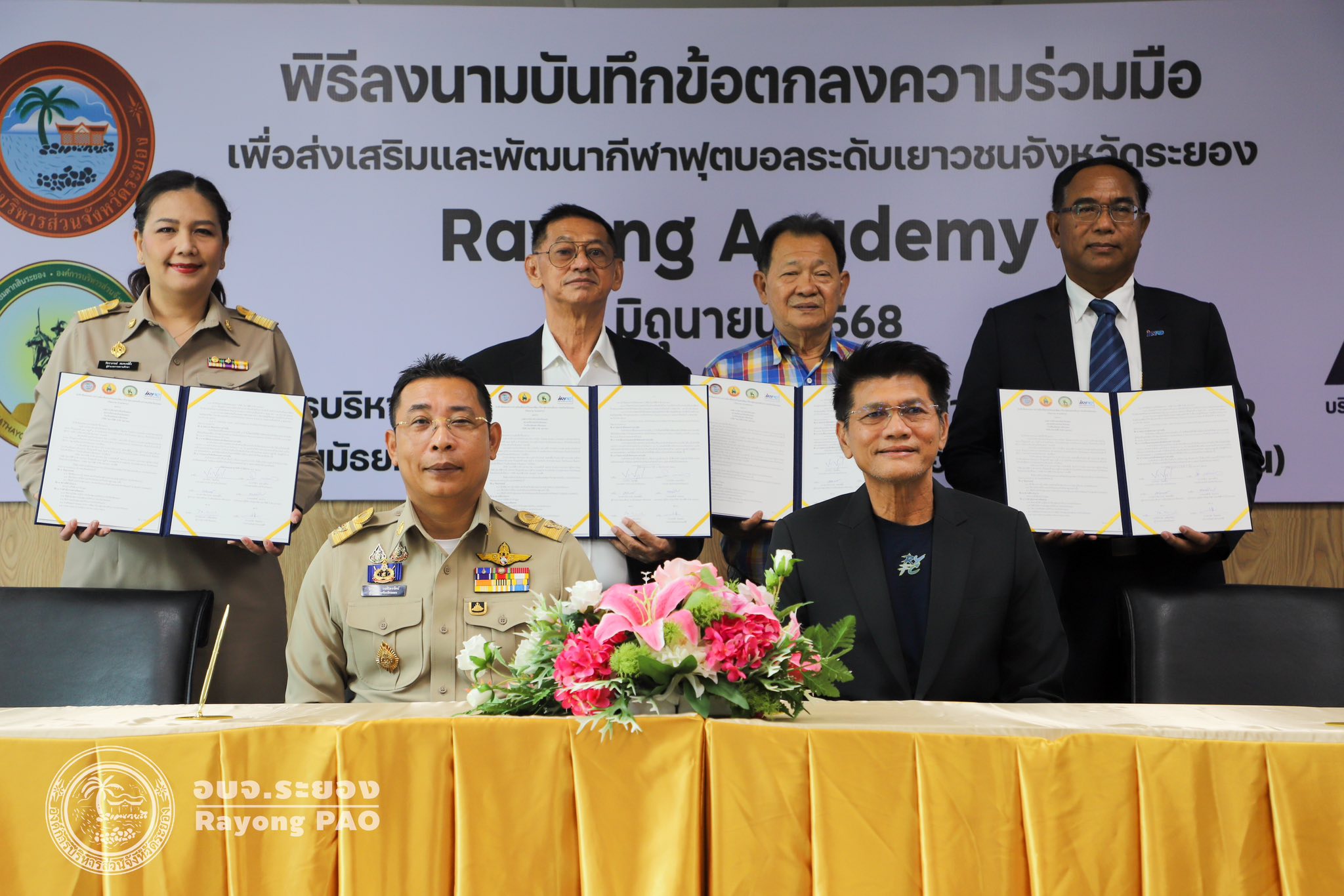 วันที่ 9 มิถุนายน 2568 เวลา 09.30 น. นายปิยะ ปิตุเตชะ นายกองค์การบริหารส่วนจังหวัดระยอง พร้อมด้วย นายวิเชียร แสงวงศ์กิจ นายกสมาคมกีฬาแห่งจังหวัดระยอง นางสาววัชราภรณ์ สมพงษ์ผึ้ง ผู้อำนวยการสถานศึกษาโรงเรียนมัธยมตากสินระยอง และนายเลอศักดิ์ ทองร่วง รองกรรมการผู้จัดการใหญ่บริษัท ไออาร์พีซี จำกัด (มหาชน) ร่วมลงนามบันทึกข้อตกลงความร่วมมือเพื่อส่งเสริมและพัฒนากีฬาฟุตบอลระดับเยาวชนจังหวัดระยอง (Rayong Academy) โดยมีนายไตรภพ วงศ์ไตรรัตน์ ผู้ว่าราชการจังหวัดระยอง และนายสาธิต ปิตุเตชะ ประธานสโมสรระยองเอฟซี เป็นพยานในพิธีบันทึกข้อตกลงดังกล่าว ซึ่งมีวัตถุประสงค์เพื่อร่วมกันคิดกำหนดแนวทางการพัฒนากีฬาฟุตบอลระดับเยาวชนจังหวัดระยอง เปิดโอกาสให้เยาวชนเข้าถึงกีฬาฟุตบอลมากขึ้น จัดฝึกทักษะการเล่นฟุตบอลและการแข่งขันฟุตบอลให้เยาวชนจังหวัดระยอง สร้างนักกีฬาฟุตบอลเยาวชนจังหวัดระยองเป็นตัวแทนระดับจังหวัดและก้าวไปสู่ระดับประเทศต่อไป ณ ห้องประชุม 3 ชั้น 3 อบจ.ระยอง