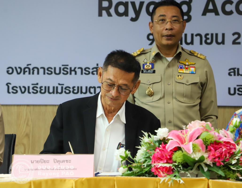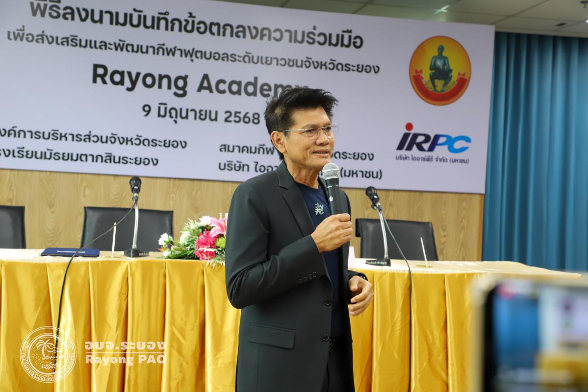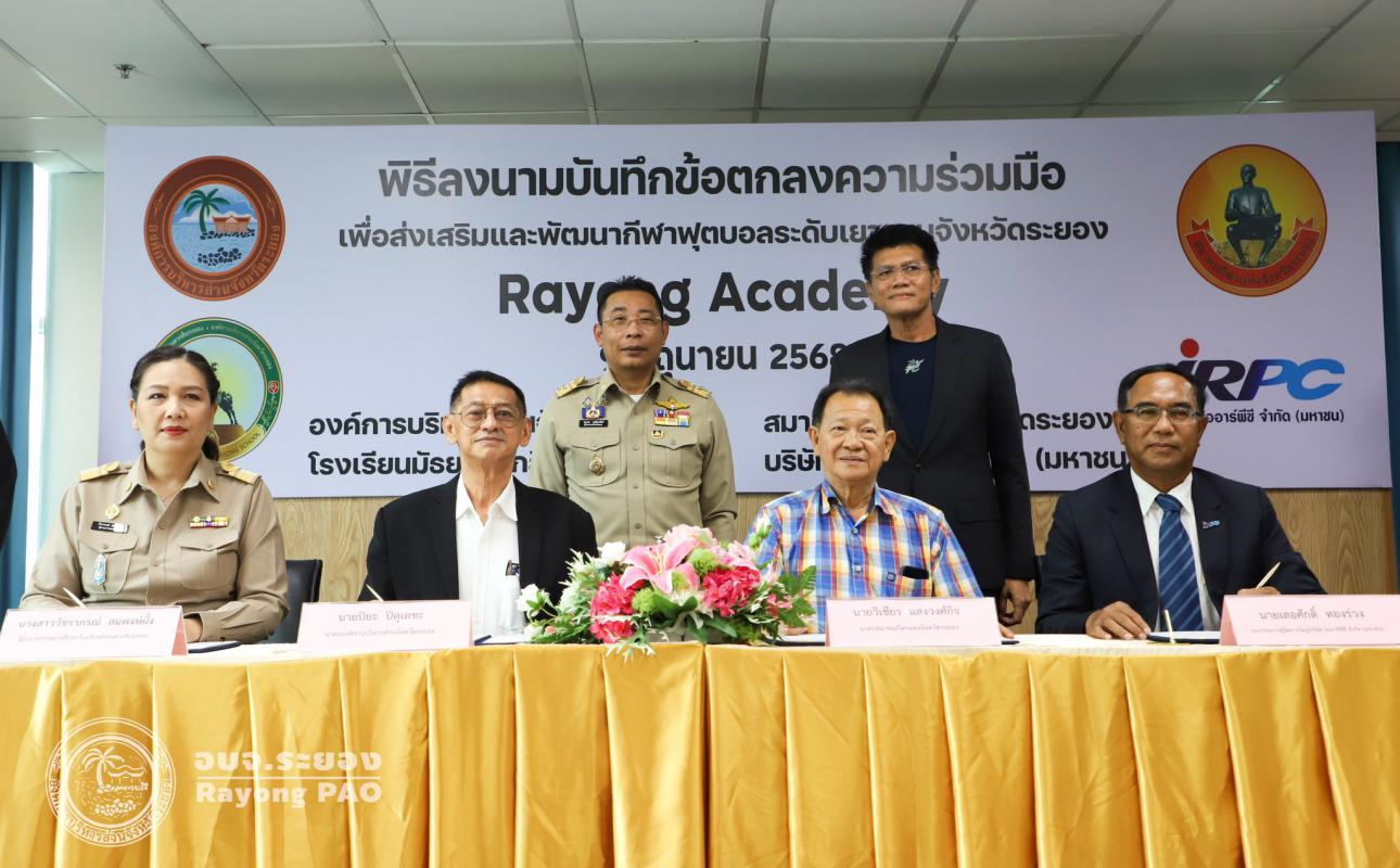 พิธีบันทึกข้อตกลงความร่วมมือเพื่อส่งเสริมและพัฒนากีฬาฟุตบอลระดับเยาวชนจังหวัดระยอง (Rayong Academy) ระหว่างองค์การบริหารส่วนจังหวัดระยอง สมาคมกีฬาแห่งจังหวัดระยอง โรงเรียนมัธยมตากสินระยอง และบริษัท ไออาร์พีซี จำกัด (มหาชน)