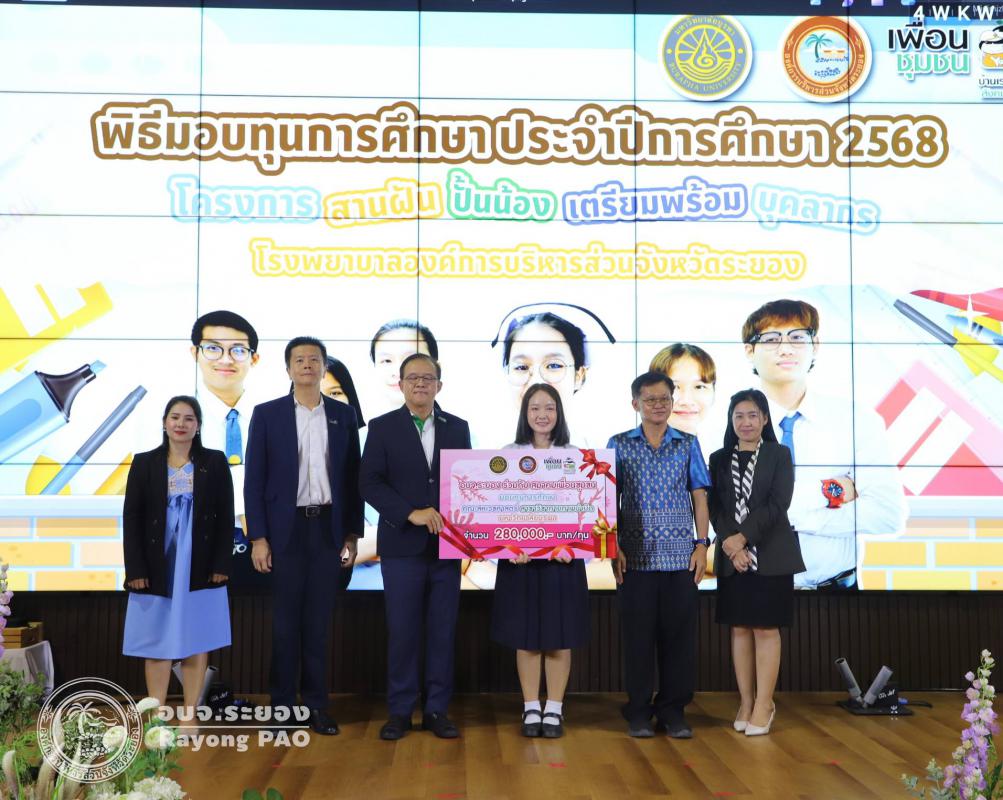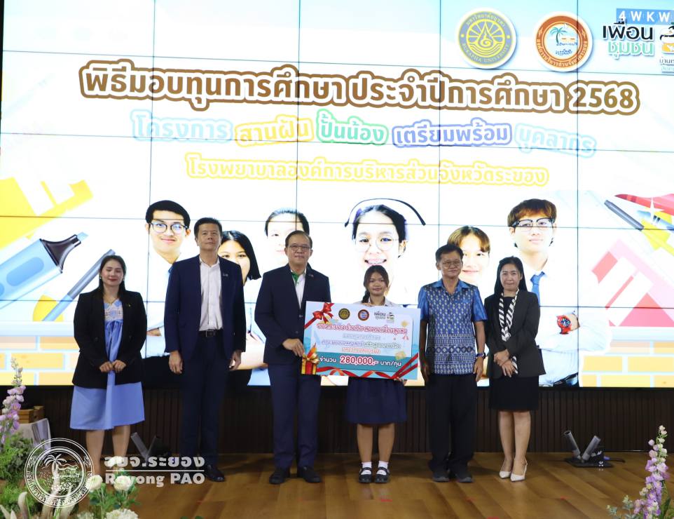 วันที่ 20 มิถุนายน 2568 เวลา 09.00 น. นายสุนทร เหรียญภูมิการกิจ ผู้เชียวชาญด้านการแพทย์และสาธารณสุข เป็นประธานเปิดโครงการสานฝัน ปั้นน้อง เตรียมพร้อมบุคลากรโรงพยาบาลองค์การบริหารส่วนจังหวัดระยอง โดยมีนางสาวอภิรดี โชติรัตน์ หัวหน้าฝ่ายบริการทางการแพทย์ เป็นผู้กล่าวรายงาน พร้อมด้วย หัวหน้าส่วนราชการ, มูลนิธิตากสินระยอง, สมาคมเพื่อนชุมชน, คณะอาจารย์ ม.บูรพา, ผู้ปกครอง และเจ้าหน้าที่ที่เกี่ยวข้อง เข้าร่วมโครงการฯ ณ อาคารปูทะเลย์มหาวิชชาลัย ศูนย์บริการการพัฒนาปลวกแดงตามพระราชดำริ จังหวัดระยอง ซึ่งทุนการศึกษาตามโครงการฯ มีจำนวนทั้งสิ้น 8 ทุน ประกอบด้วย คณะพยาบาลศาสตร์ หลักสูตรพยาบาลศาสตรบัณฑิต จำนวน 5 ทุน และคณะสหเวชศาสตร์ หลักสูตรวิทยาศาสตรบัณฑิต สาขาวิชากายภาพบำบัด จำนวน 3 ทุน พร้อมกันนี้ยังได้จัดพิธีมอบทุนการศึกษา ปีการศึกษา 2568 และพิธีปัจฉิมนิเทศนิสิตทุนที่สำเร็จการศึกษา รุ่นที่ 2 ปีการศึกษา 2564 - 2567 จำนวน 14 ทุน และนิสิตผู้ได้รับทุนจะได้รับฟังข้อตกลงและเงื่อนไขตามสัญญาการรับทุน สัญญาค้ำประกันผู้รับทุน และรับฟังหน้าที่ความรับผิดชอบของนิสิตทุน หลักการปฏิบัติตน แนะนำแนวทางการเบิกเงินทุนการศึกษา การรักษาผลการเรียน โดยผู้ดูแลนิสิตทุนฯ รวมทั้งการเตรียมความพร้อมก่อนเข้าสู่รั้วมหาวิทยาลัยในหัวข้อ "วางแผนการเรียนอย่างไรให้ประสบผลสำเร็จและมีประสิทธิภาพ" และนิสิตทุนได้เข้าพิธีบายศรีสู่ขวัญ ซึ่งได้รับเกียรติจากคณะผู้บริหารร่วมผูกข้อมือในพิธีบายศรีสู่ขวัญครั้งนี้ด้วย