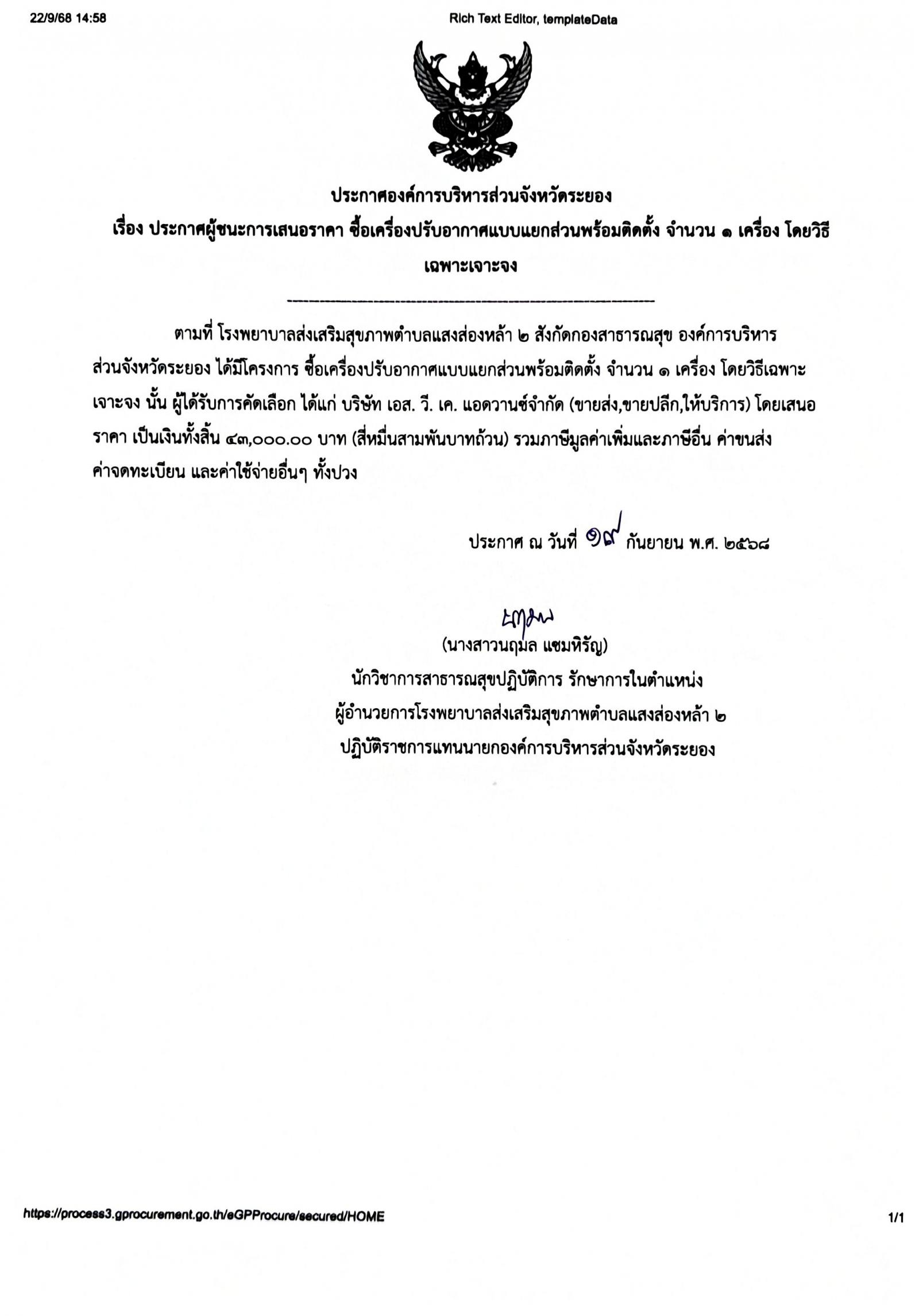 ประกาศผู้ชนะการเสนอราคา ซื้อเครื่องปรับอาการแบบแยกส่วนพร้อมติดตั้ง จำนวน 1 เครื่อง โดยวิธีเฉพาะเจาะจง
