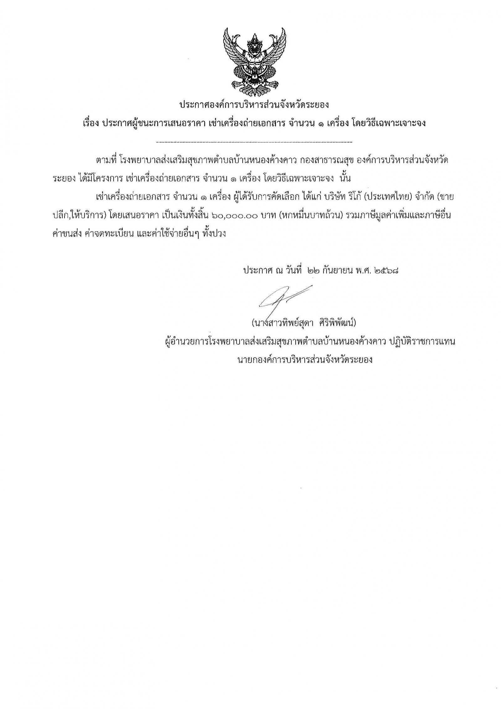 📌ประกาศผู้ชนะการเสนอราีคา จ้างเหมาจัดทำทำเนียบองค์การบริหารส่วนจัหวัดระยอง