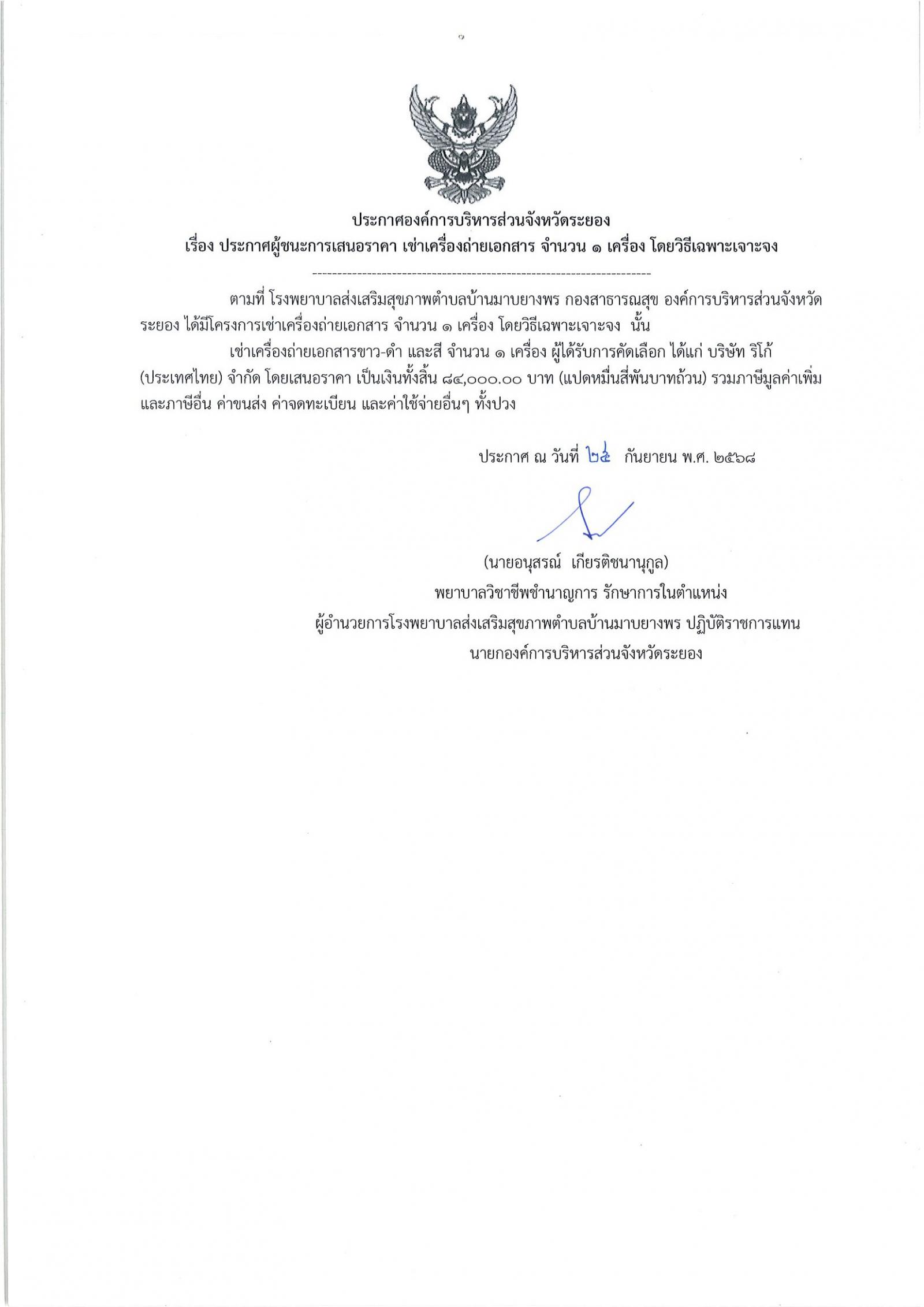 📌ประกาศผู้ชนะการเสนอราีคา จ้างเหมาจัดทำทำเนียบองค์การบริหารส่วนจัหวัดระยอง