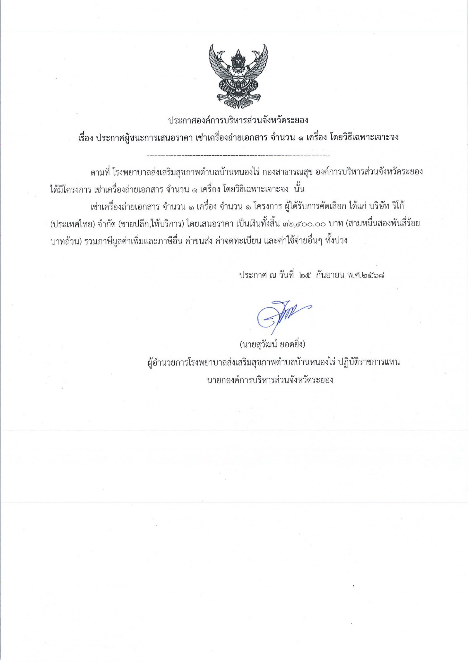 📌ประกาศผู้ชนะการเสนอราีคา จ้างเหมาจัดทำทำเนียบองค์การบริหารส่วนจัหวัดระยอง