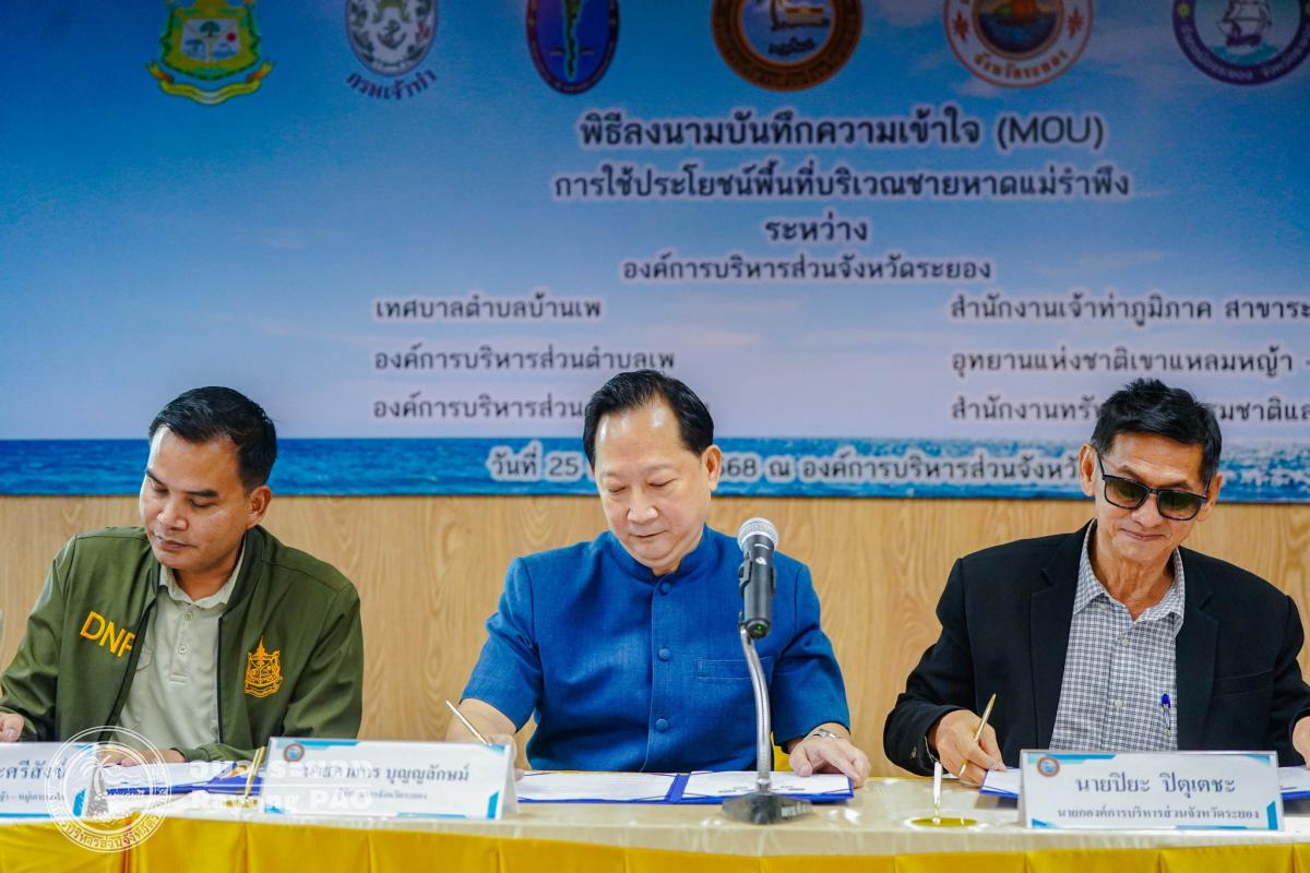 วันที่ 25 กันยายน 2568 เวลา 10.00 น. ณ ห้องประชุมองค์การบริหารส่วนจังหวัดระยอง นายปิยะ ปิตุเตชะ นายกองค์การบริหารส่วนจังหวัดระยอง พร้อมด้วย คณะผู้บริหาร หัวหน้าส่วนราชการ ผู้แทนองค์กรปกครองส่วนท้องถิ่น และผู้ที่เกี่ยวข้องเข้าร่วมพิธีลงนามบันทึกข้อตกลงความเข้าใจ (MOU) เรื่อง การใช้ประโยชน์พื้นที่บริเวณชายหาดแม่รำพึง โดยมี นายภาสกร บุญญลักษม์ ผู้ว่าราชการจังหวัดระยอง เป็นประธานในพิธีฯ ร่วมลงนามเป็นสักขีพยาน พร้อมด้วย 7 หน่วยงาน ประกอบด้วย องค์การบริหารส่วนจังหวัดระยอง, เทศบาลตำบลบ้านเพ, องค์การบริหารส่วนตำบลตะพง, องค์การบริหารส่วนตำบลเพ, สำนักงานเจ้าท่าภูมิภาค สาขาระยอง, อุทยานแห่งชาติเขาแหลมหญ้า - หมู่เกาะเสม็ด และสำนักงานทรัพยากรธรรมชาติและสิ่งแวดล้อม