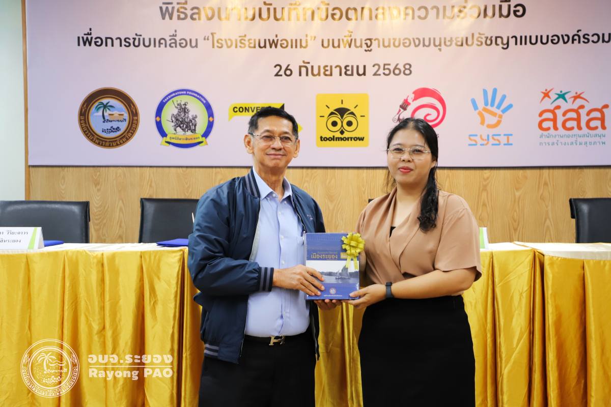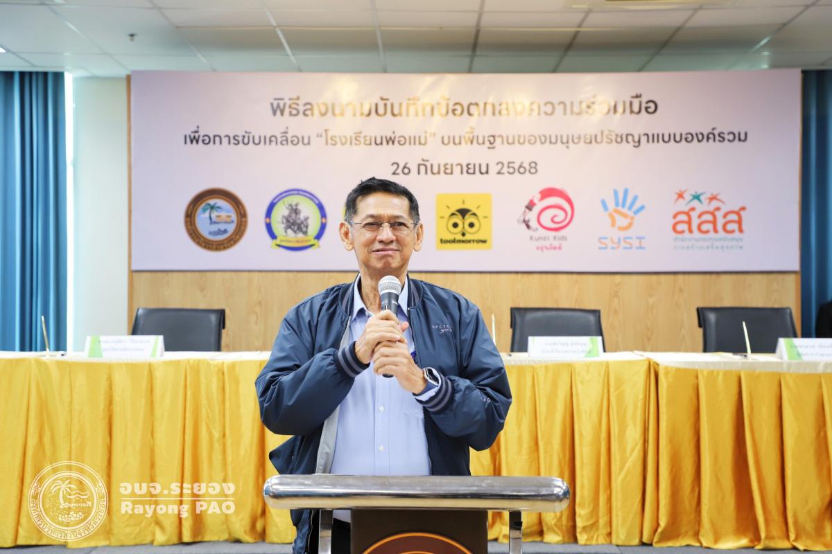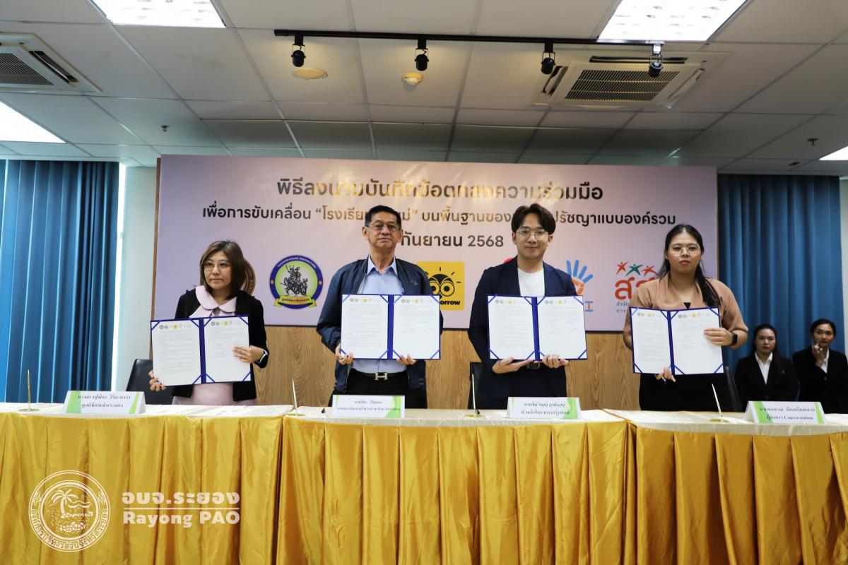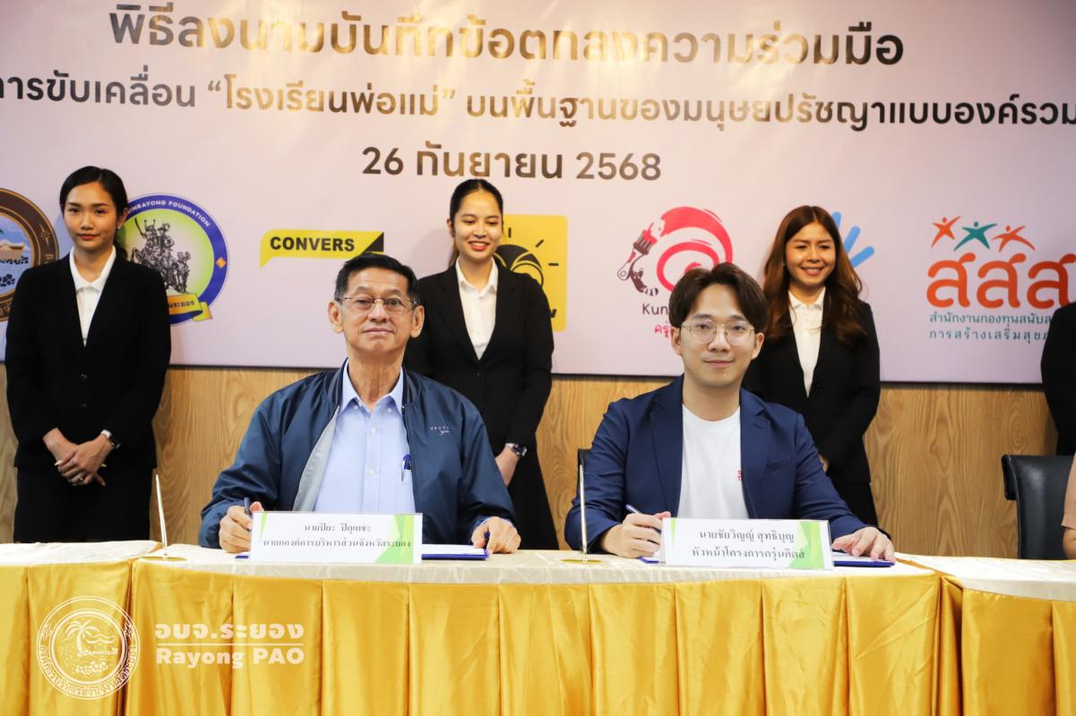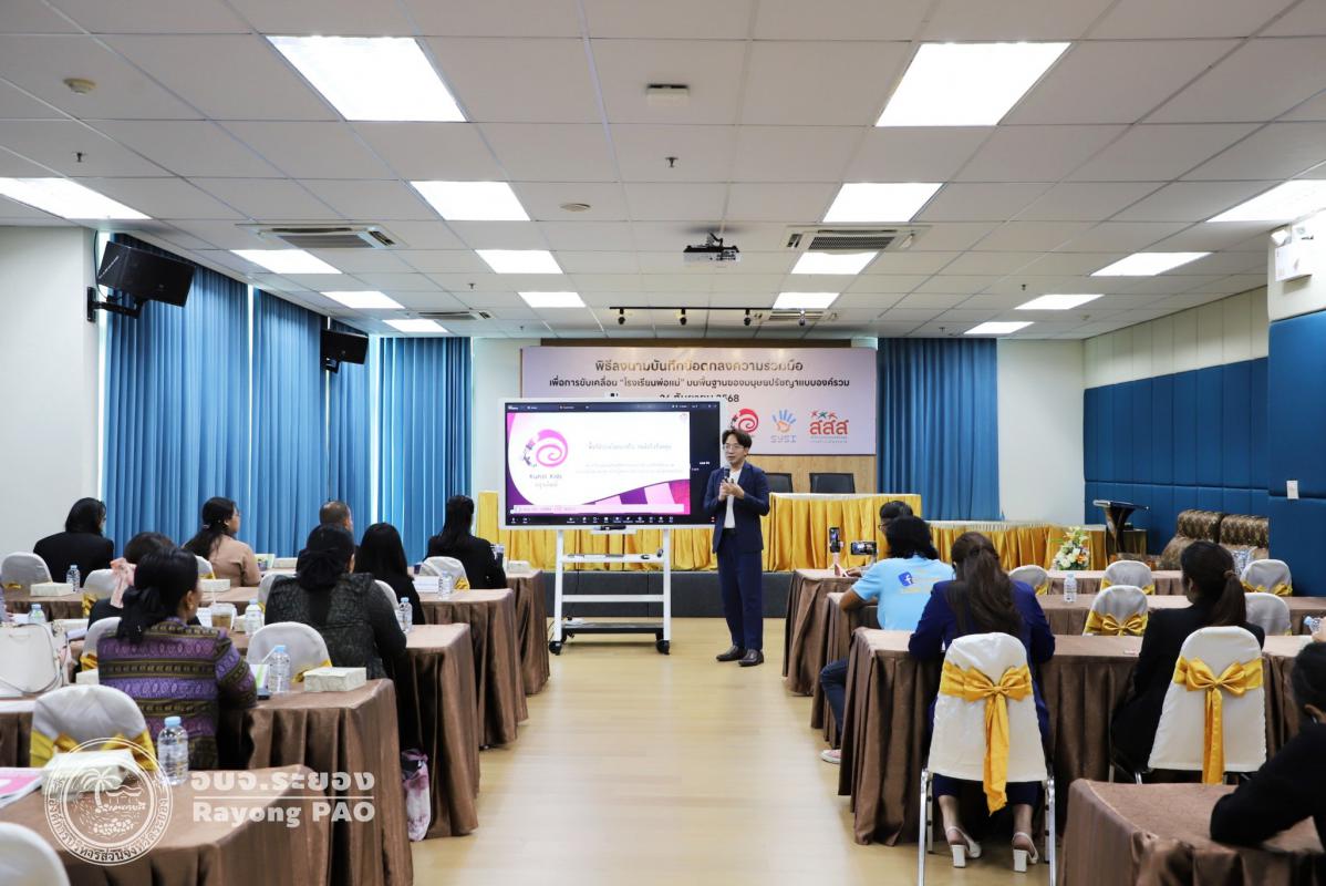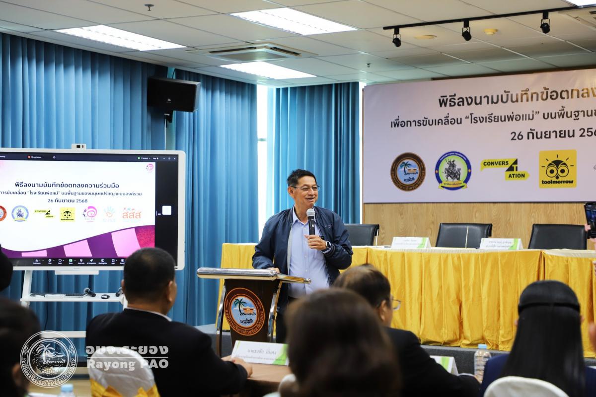 วันที่ 26 กันยายน 2568 เวลา 13.00 น. นายปิยะ ปิตุเตชะ นายกองค์การบริหารส่วนจังหวัดระยอง พร้อมด้วย คณะผู้บริหาร หัวหน้าส่วนราชการ และผู้ที่เกี่ยวข้องเข้าร่วมพิธีลงนามบันทึกข้อตกลงความเข้าใจ (MOU) เรื่อง โรงเรียนพ่อแม่ บนพื้นฐานของมนุษยปรัชญาแบบองค์รวม ระหว่างครุ่นคิดส์กับองค์การบริหารส่วนจังหวัดระยอง