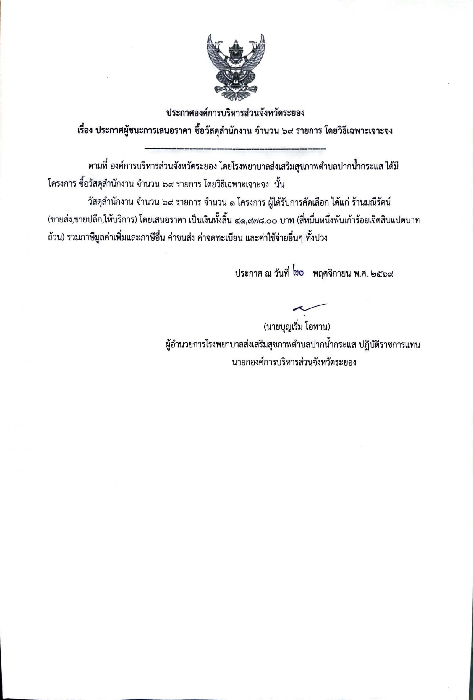 ประกาศผู้ชนะการเสนอราคา ซื้อวัสดุสำนักงาน จำนวน 69 รายการ โดยวิธีเฉพาะเจาะจง