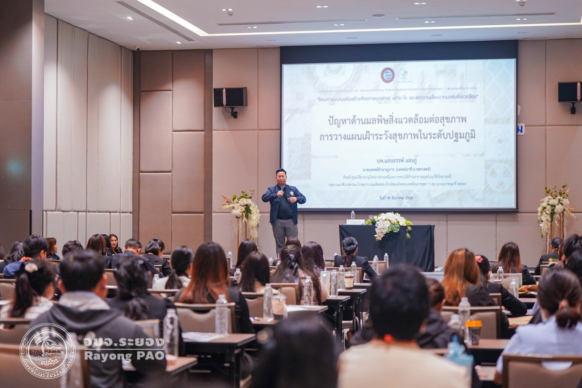 วันที่ 19 ธันวาคม 2568 เวลา 09.00 น. นายแพทย์สุนทร เหรียญภูมิการกิจ ผู้ทรงคุณวุฒิเฉพาะด้านการแพทย์และเวชกรรมป้องกัน เป็นประธานเปิดโครงการอบรมเสริมสร้างศักยภาพบุคลากร เฝ้าระวัง ลดความเสี่ยงจากมลพิษสิ่งแวดล้อม พร้อมด้วย นายสุริยะ ศิริวัฒน์ ผู้อำนวยการกองสาธารณสุข, นางเสาวนีย์ อุ่ยตระกูล ที่ปรึกษาด้านสาธารณสุข บุคลากรด้านสาธารณสุข และผู้ที่เกี่ยวข้องเข้าร่วมพิธีเปิดโครงการฯ โดยพร้อมเพรียงกัน ซึ่งโครงการดังกล่าวจัดขึ้นเพื่อพัฒนาศักยภาพบุคลากรด้านสาธารณสุขให้มีความรู้และทักษะในการเฝ้าระวัง และลดความเสี่ยงจากมลพิษสิ่งแวดล้อม รวมถึงลดอุบัติการณ์โรคจากการประกอบอาชีพและสิ่งแวดล้อมในจังหวัดระยอง โดยมีวิทยากรจากศูนย์เชี่ยวชาญโรคจากสารเคมีและการตอบโต้ด้านสาธารณสุขในอุบัติภัยสารเคมี และกลุ่มงานอาชีวเวชกรรม จากโรงพยาบาลเฉลิมพระเกียรติ สมเด็จพระเทพรัตนราชสุดาฯ สยามบรมราชกุมารี ระยอง มาบรรยายให้ความรู้ในหัวข้อ “เรื่อง ปัญหาด้านมลพิษสิ่งแวดล้อมต่อสุขภาพ การวางแผนเฝ้าระวังสุขภาพของบุคลากรด้านสาธารรสุข และการพัฒนาแนวทางกูแลสุขภาพในระดับปฐมภูมิ” และ “การประเมินสุขภาพจากเหตุมลพิษสิ่งแวดล้อม และการสื่อสารภาคประชาชน” ณ ห้องประชุม โรงแรมแทมมารินด์ การ์เด้น ระยอง อำเภอเมืองระยอง จังหวัดระยอง
