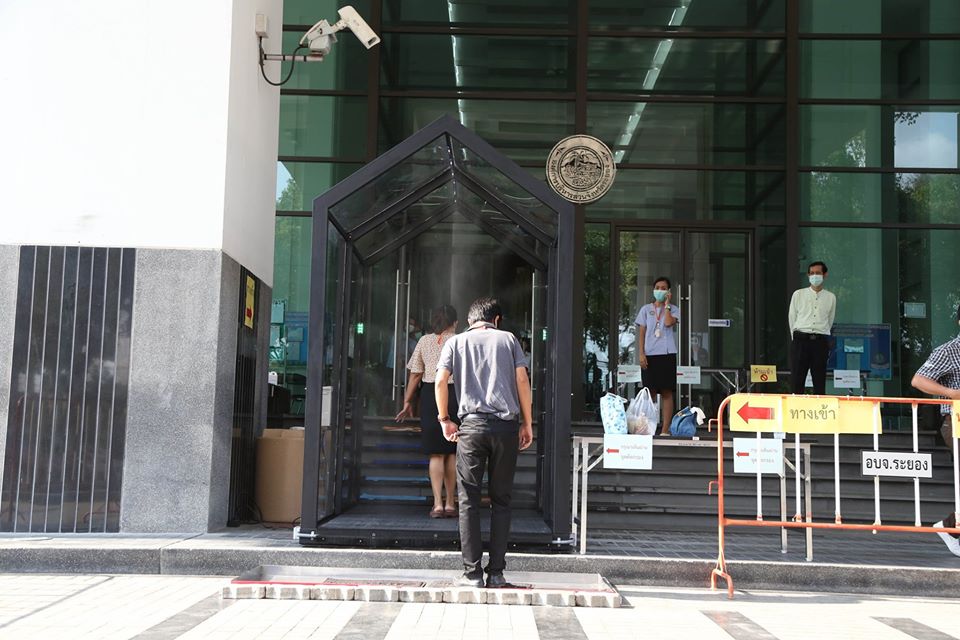 อบจ.ระยอง ติดตั้งอุโมงค์พ่นยาฆ่าเชื้อก่อนเข้าอาคารสำนักงาน เพื่อลดความเสี่ยงจากCovid-19 ให้แก่ประชาชน และข้าราชการ พนักงาน อบจ.ระยอง โดย ขั้นตอนแรก ย่ำบนผ้าเช็ดเท้าก่อนเดินเข้าไปในอุโมงค์พ่นยาฆ่าเชื้อ หลังจากนั้น เข้าไปในอุโมง และเดินออกมา ทำการย่ำบนผ้าเช็ดร้องเท้าอีกครั้ง ต่อจากนั้นเดินเข้ามายังจุดคัดกรองวัดอุณหภูมิร่างกายโดยพยาบาลวิชาชีพและล้างมือด้วยแอลกอฮอล์ล์ก่อนเข้าไปในอาคารองค์การบริหารส่วนจังหวัดระยอง