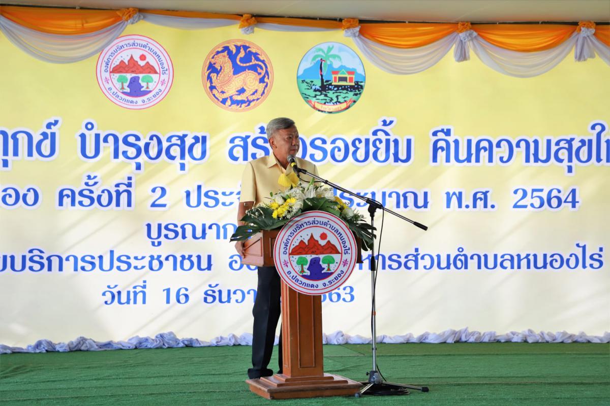วันที่ 16 ธันวาคม 2563 เวลา 08.30 น. ณ องค์การบริหารส่วนตำบลหนองไร่ หมู่ที่ 3 ตำบลหนองไร่ อำเภอปลวกแดง จังหวัดระยอง นายชาญนะ เอี่ยมแสง ผู้ว่าราชการจังหวัดระยอง มาเป็นประธานเปิดเคลื่อนที่ โครงการ "หน่วยบำบัดทุกข์ บำรุงสุข สร้างรอยยิ้มคืนความสุขให้กับประชาชน จังหวัดระยอง ครั้งที่ 2/2564 " และนำหน่วยบริการเคลื่อนที่จากส่วนราชการต่างๆ ตามโครงการ"หน่วยบำบัดทุกข์ บำรุงสุข สร้างรอยยิ้มคืนความสุขให้กับประชาชน ออกให้บริการประชาชน โดยมีหัวหน้าส่วนราชการ ข้าราชการและพนักงานจ้างขององค์การบริหารส่วนจังหวัดระยอง และหน่วยงานบริการเคลื่อนที่ต่างๆ ร่วมให้บริการในหลายๆด้าน อาทิเช่น ถุงอุปโภคบริโภค มอบทุนการศึกษา นิทรรศการความรู้ด้านต่างๆ นอกจากนี้ยังได้มารับทราบปัญหาความต้องการ ความเดือดร้อนของประชาชนในพื้นที่ เพื่อนำกลับไปจัดทำแผนงบประมาณให้การช่วยเหลือต่อไปอีกด้วย