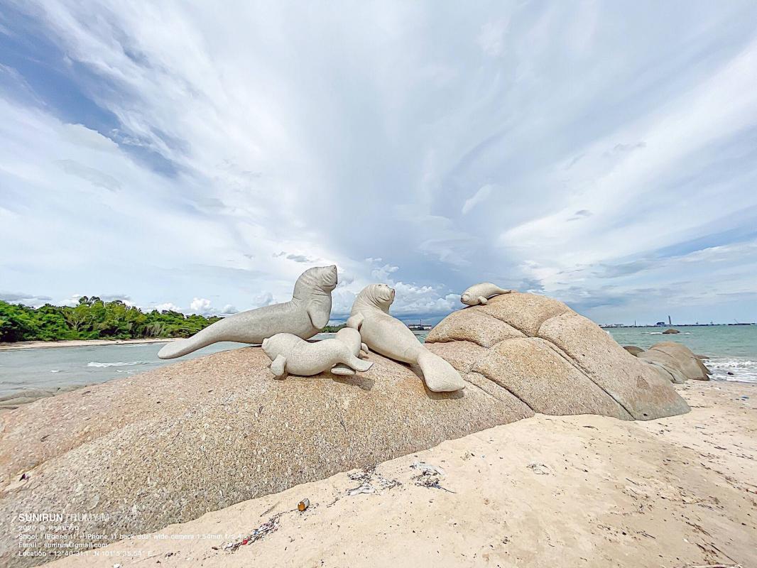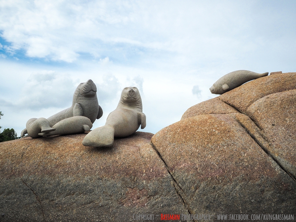 ปลาพยูนอยู่บนหิน ประกอบไปด้วย ศาลาไว้บริการนักท่องเที่ยวและสัญลักษณ์หาดคือ รูปปลาพะยูนจำนวน 5 ตัว ตั้งอยู่โดดเด่นบนโขดหิน