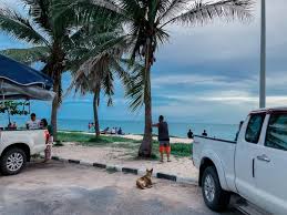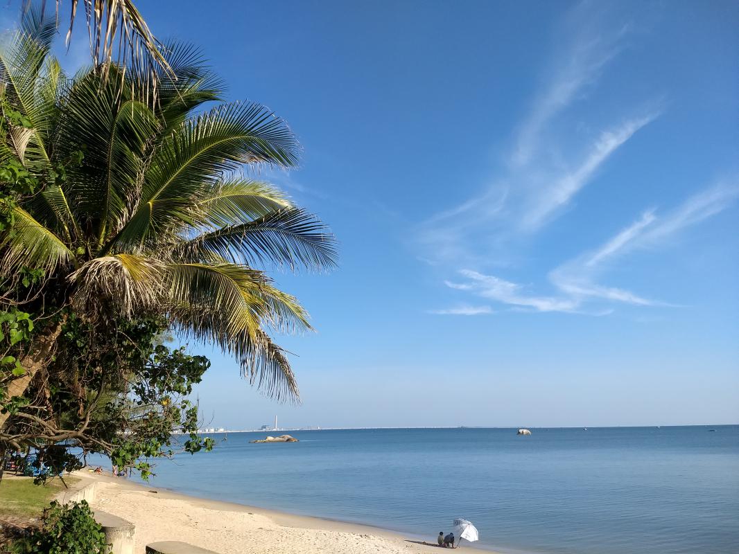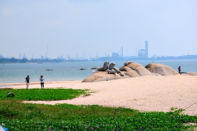 จะมีสะพานข้ามไปตัวอำเภอบ้านฉาง ให้ชิดซ้ายไปกลับรถใต้สะพาน ด้านซ้ายมือ จะมีถนนเข้าสู่ชายหาด ระยะทางประมาณ 5 กิโลเมตร