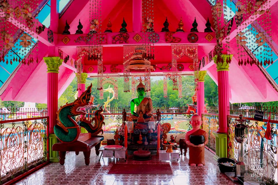 เราไปดูอีกฝั่งของถนนกันบ้าง เมื่อเดินมาที่ฝั่งซ้าย จะมีศาลากลางน้ำสีสันสวยงามสะดุดตามาก เป็นศาลาสีชมพู