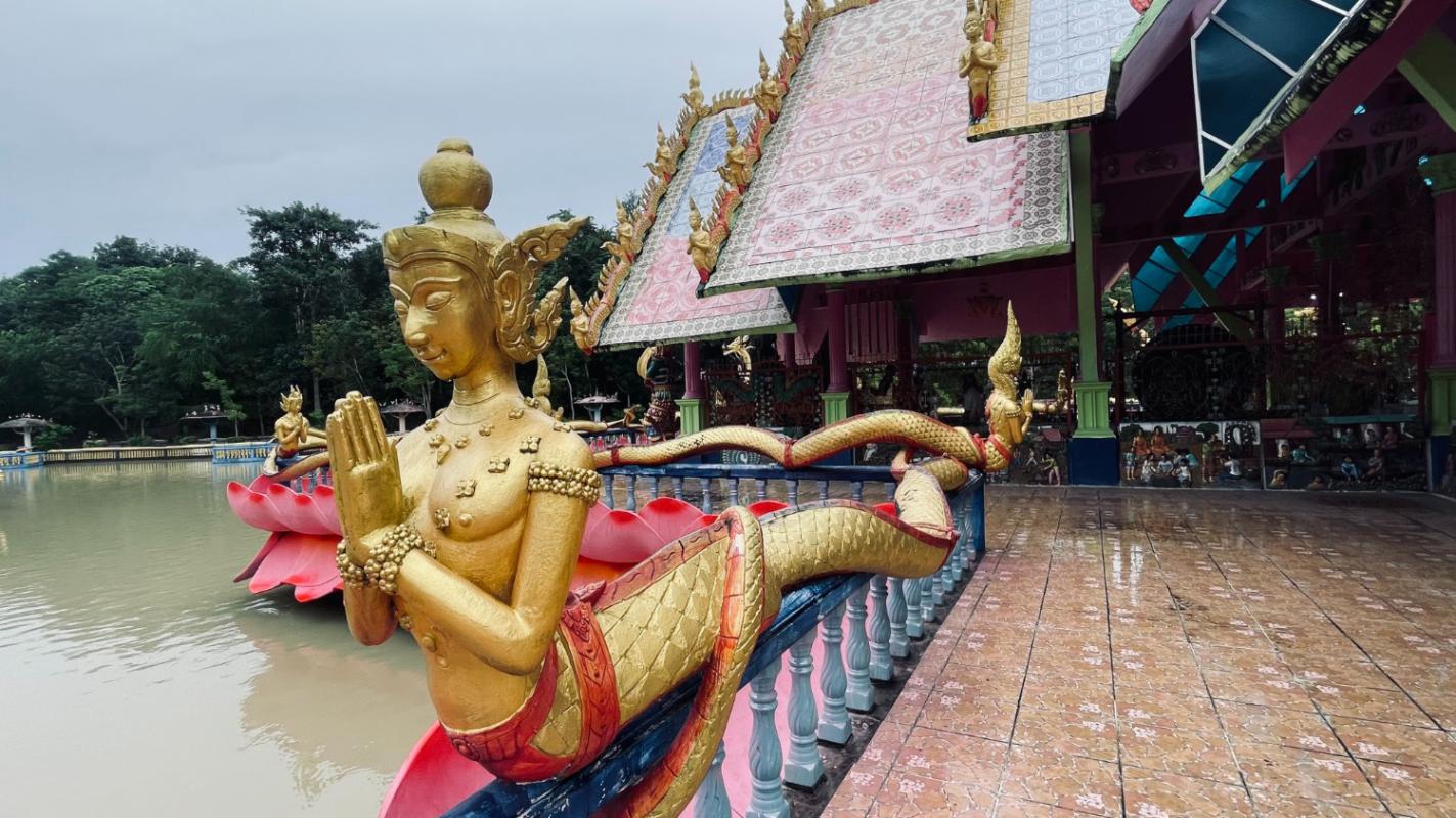 รอบศาลาที่เป็นกำแพงรั้วตรงทางเดิน และรอบสระ มีรูปปั้นของงู และ พญานาค อยู่โดยรอบ