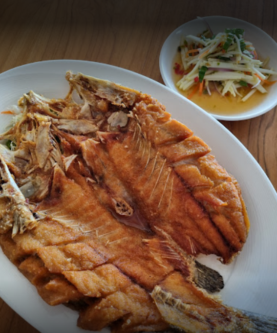 ปลากระพงโบราณ เนื้อปลาสด ราดด้วยน้ำปลาโรยด้วยเม็ดมะม่วง รสชาติคือลงตัวเลยค่ะ