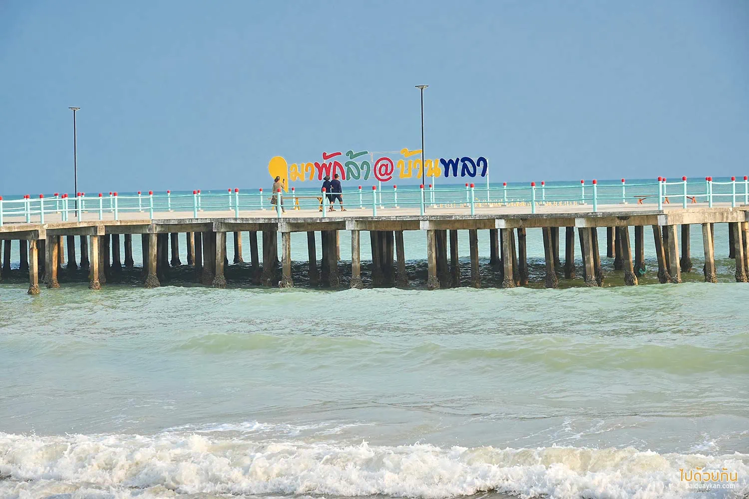 ท่าเรือมีสะพานปูนทอดยาวริมทะเล ให้เดินเล่น รับลม มีป้ายชื่อ “ มาพักล้า @ บ้านพลา” สีสันสดใส เป็น