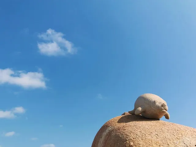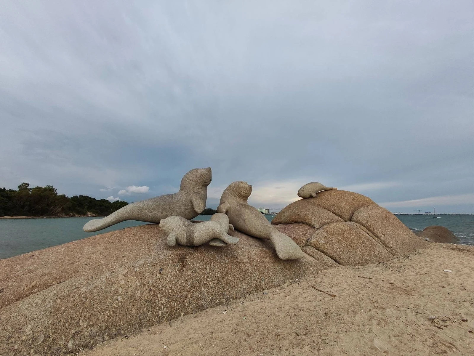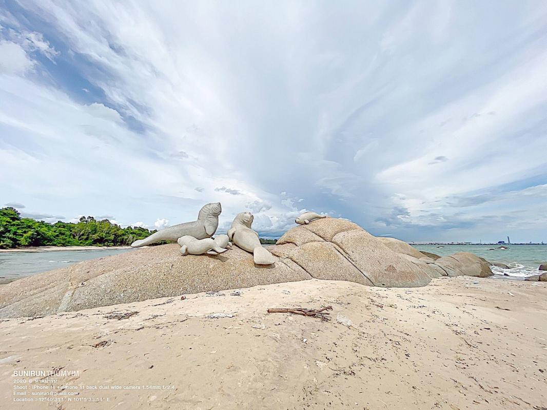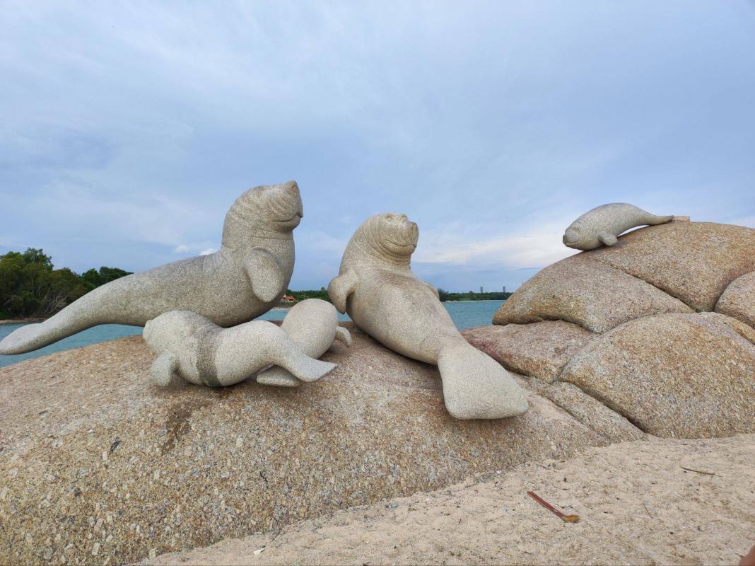 และเงียบสงบ เหมาะกับการเล่นน้ำและพักผ่อนเป็นที่สุด ที่บริเวณปลายหาดจะมีรูปปั้นปลาพะยูนอยู่บนหิน