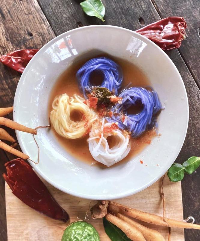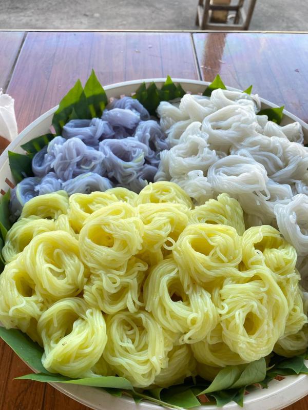 เป็นขนมจีนเส้นสด หลากสีสันสัน ทั้งเหลืองขมิ้น ม่วงอัญชัน